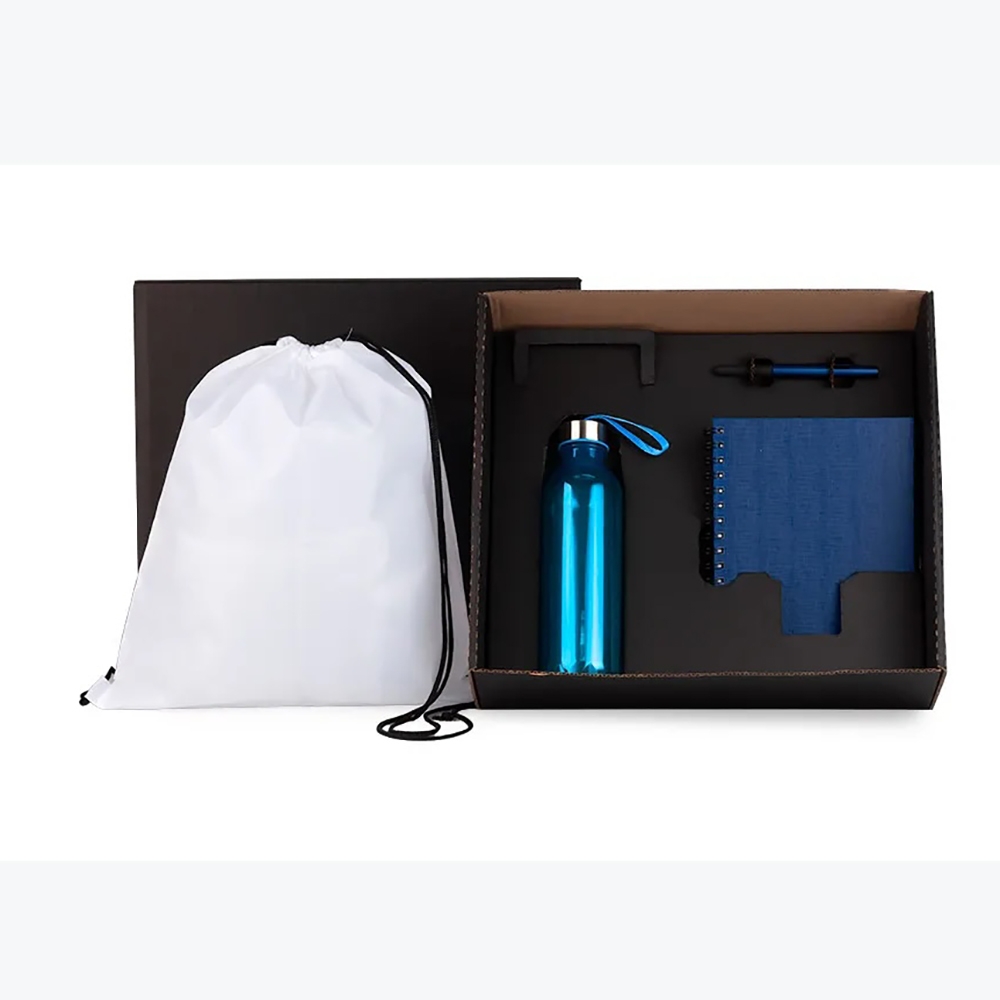 Kit boas vindas. Conta com mochila em nylon 420 branca; garrafa azul em pet; caderno para anotações wire-o azul com capa dura e caneta esferográfica em ABS azul. Tipo de gravação: Uma gravação em Silkscreen na mochila, garrafa e no caderno. Dimensões do produto: Caderno: 23,5x18x2,5cm Dimensões da embalagem: 395x347x120 mm (AxLxP) Peso da embalagem: 965 g Embalagem do produto: Caixa Preta