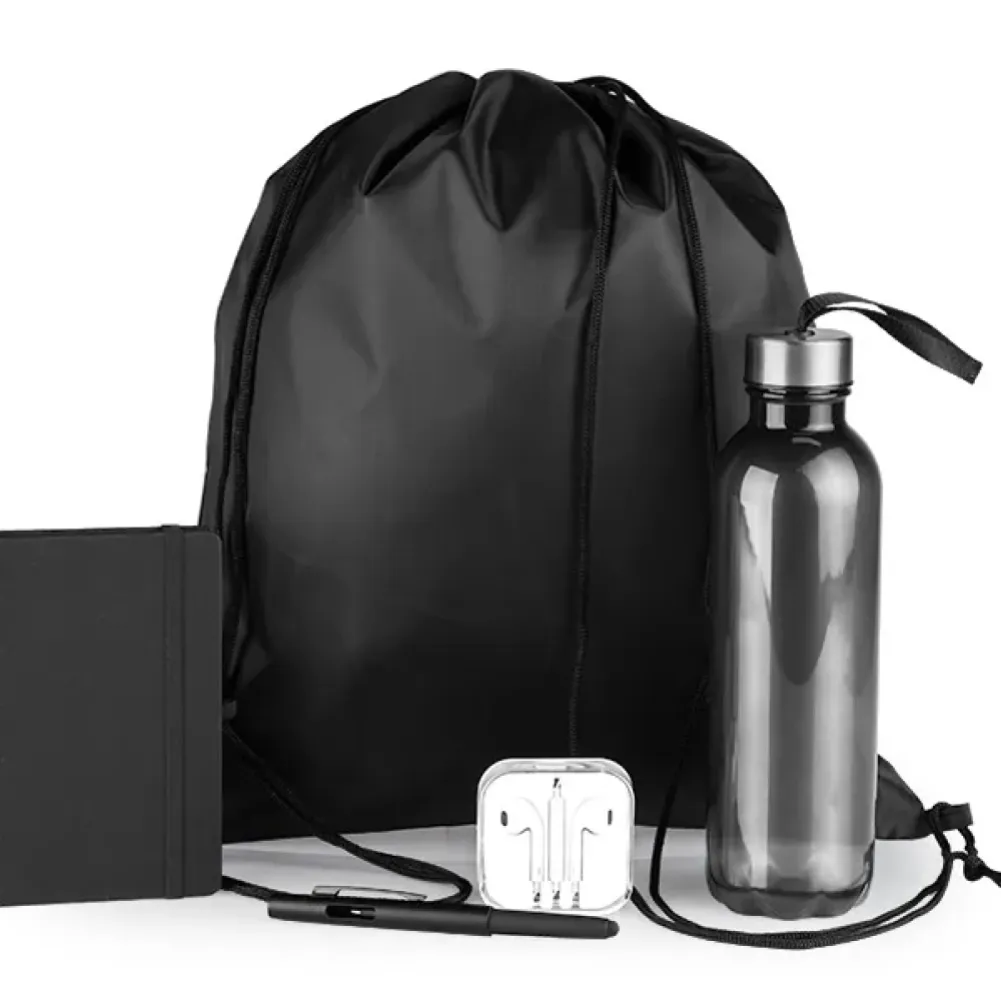 Kit boas vindas. Conta com mochila em nylon 420, garrafa pet, fone de ouvido, caderno sem pauta e caneta esferográfica com tampa e ponta touch. Tipo de gravação: Uma gravação em Silkscreen na mochila, no caderno e na garrafa. Dimensões do produto: Dimensão da sacola: 35x41cm Dimensões da embalagem: 350x410x0 mm (AxLxP) Peso da embalagem: 337 g Embalagem do produto: Plástica (Embalados na mochila sacola)