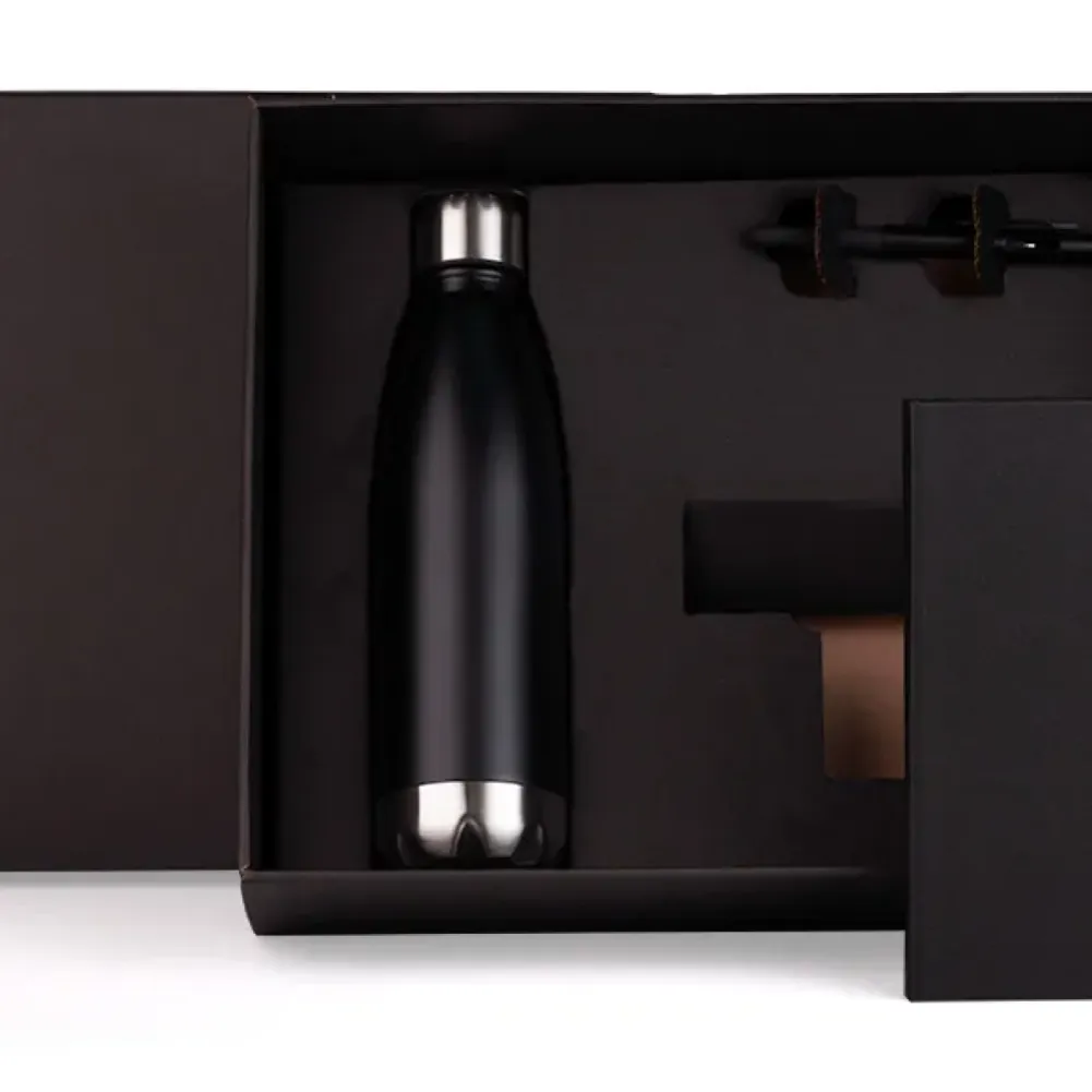 Kit composto por garrafa em aço Inox preta com tampa rosqueável; caderno para anotações preto com capa dura e caneta esferográfica em ABS preta. Tipo de gravação: Uma gravação a Laser na garrafa; gravação em Silk Screen no caderno. Dimensões do produto: Caderno: 14x21 cm Dimensões da embalagem: 366x298x100 mm (AxLxP) Peso da embalagem: 775 g Embalagem do produto: Caixa Preta