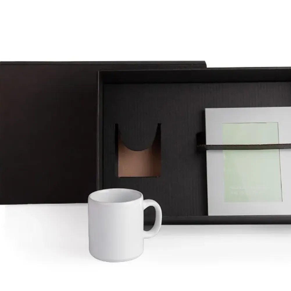 Kit contendo caneca em cerâmica na cor branca com capacidade de 270 ml e porta-retrato em alumínio fosco com vidro frontal, apoio em polipropileno preto e uma fina espuma no interior para acomodar melhor a foto. Tipo de gravação: Uma gravação em Silk-Screen na caneca e gravação a Laser no porta-retrato. Dimensões do produto: Caneca: 270 ml Dimensões da embalagem: 353x242x95 mm (AxLxP) Peso da embalagem: 625 g Embalagem do produto: Caixa Preta