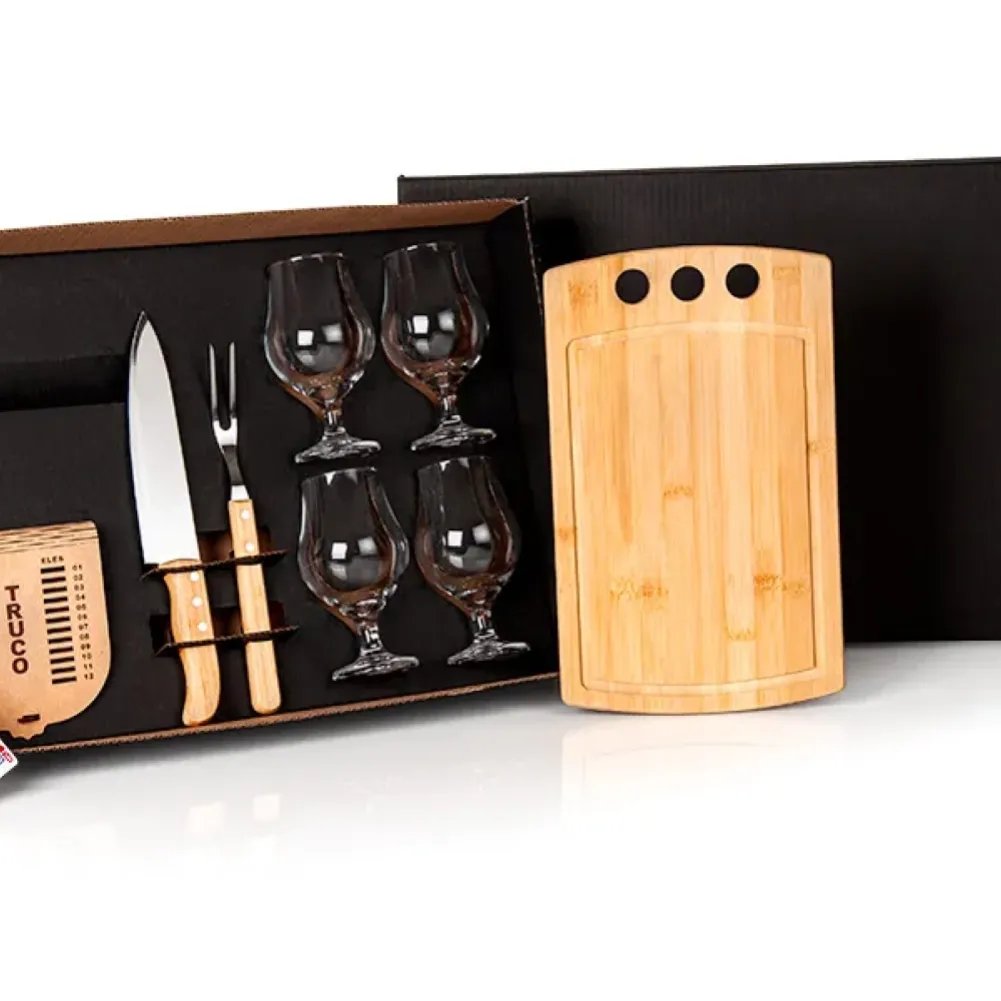 Conjunto para churrasco/cerveja/truco; Acompanha tábua com três furos em bambu; Faca 8 e garfo em bambu/inox; Quatro copos de cerveja em vidro; Caixa para truco com marcador de tentos e jogos em MDF; Jogo de cartas. Como cortesia, na faca 8" fazemos uma gravação com os cortes do boi. Tipo de gravação: Uma gravação a Laser nos quatro copos, na tábua, na lâmina da faca e na tampa da caixa. Dimensões do produto: Tábua: 37x22,5x1,2cm Dimensões da embalagem: 575x395x120 mm (AxLxP) Peso da embalagem: 2.398 g Embalagem do produto: Caixa Preta