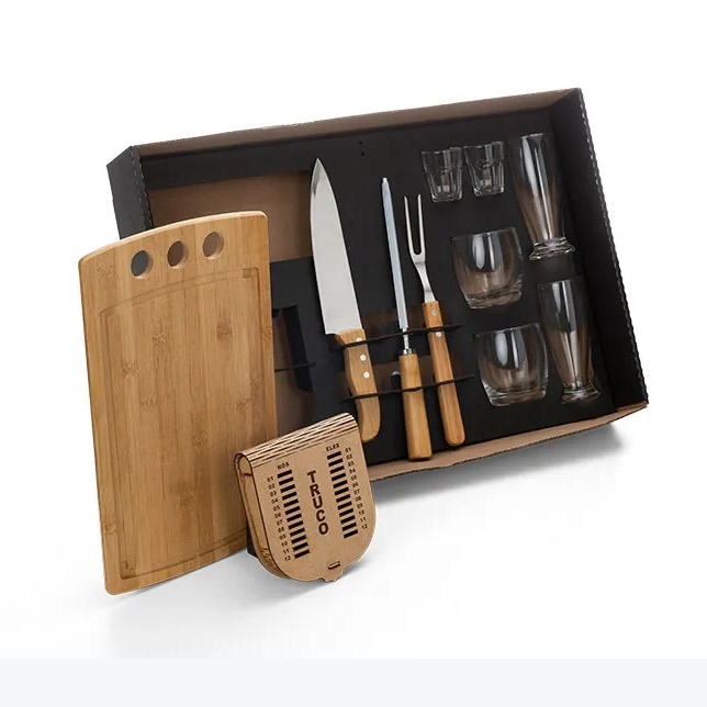 Kit contendo tábua com três furos em bambu; Faca 8 e garfo em bambu/inox; Dois copos de cerveja, dois copos de whisky e dois copinhos de dose em vidro; Caixa para truco com marcador de tentos e jogos em MDF; Jogo de cartas. Como cortesia, na faca 8" fazemos uma gravação com os cortes do boi. Tipo de gravação: Uma gravação a Laser nos seis copos, na tábua, na lâmina da faca e na tampa da caixa. Dimensões do produto: Tábua: 37x22,5x1,2cm Dimensões da embalagem: 575x395x120 mm (AxLxP) Peso da embalagem: 2.636 g Embalagem do produto: Caixa Preta
