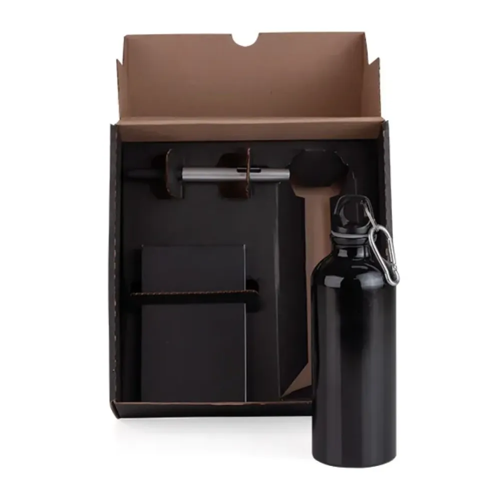 Kit squeeze, caneta e bloco. Composto por garrafa em alumínio de 500ml revestido com verniz; bloco para anotações preto e caneta esferográfica em ABS prata. Tipo de gravação: Uma gravação a Laser na garrafa; gravação em Silk Screen na bloco e na caneta. Dimensões do produto: Squeeze: 21x6,5Øcm Dimensões da embalagem: 232x232x92 mm (AxLxP) Peso da embalagem: 315 g Embalagem do produto: Caixa Preta