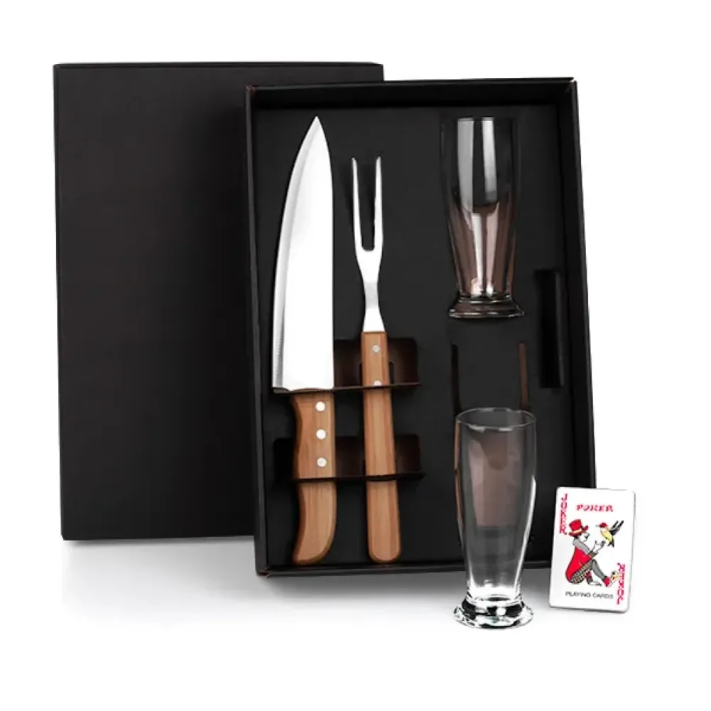 Kit de copos e facas. Conta com dois copos de vidro para cerveja/drinks; faca 8" e garfo trinchante em bambu/inox; conta também com jogo de baralho. Capacidade: 200ml cada copo Tipo de gravação: Uma gravação a Laser nos dois copos. Dimensões do produto: Copo: Ø5,8x14,5cm Dimensões da embalagem: 353x242x95 mm (AxLxP) Peso da embalagem: 870 g Embalagem do produto: Caixa Preta