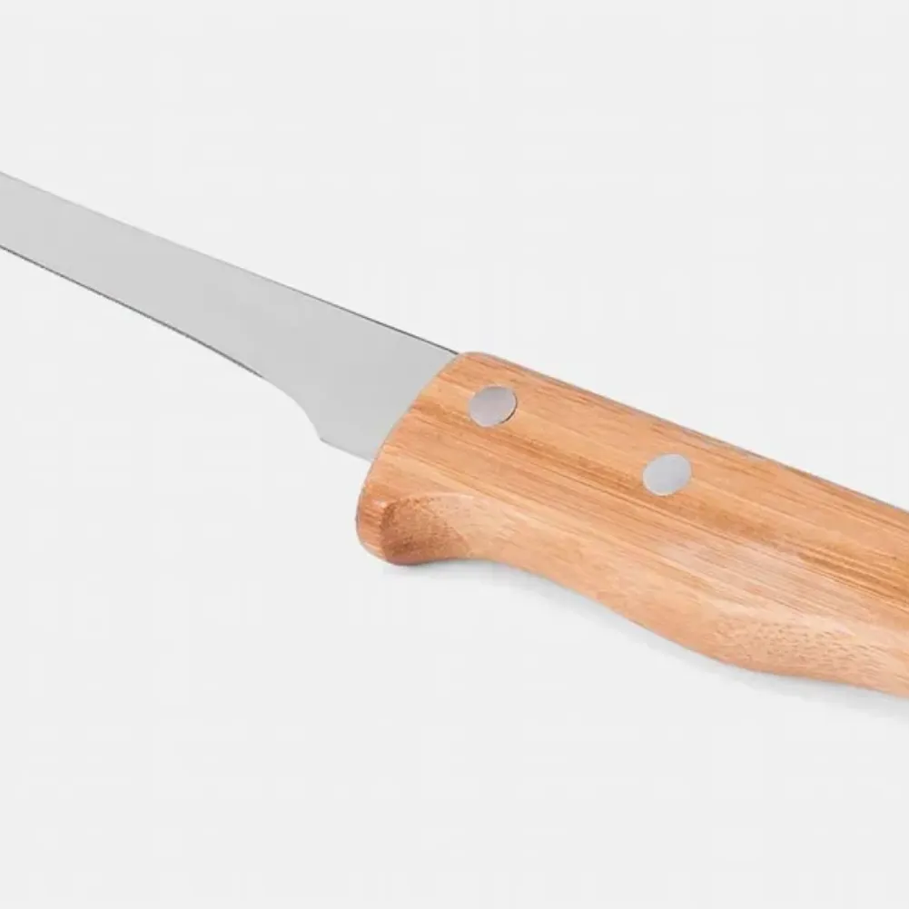 Kit composto por seis peças com cabos em bambu e lâminas em aço Inox com rebites resistentes, sendo uma faca 8” para carnes, um garfo trinchante, uma faca 5” para desossar, uma faca 4” de frutas e uma faca 3” de legumes e uma chaira 8” para assentar o fio das facas. Estão organizados em um estojo com toque almofadado. Tipo de gravação: Uma gravação em Silk-Screen no estojo e uma a Laser na lâmina da faca 8". Dimensões do produto: Estojo aberto: 36,5x31,5x0,8cm Dimensões da embalagem: 373x180x43 mm (AxLxP) Peso da embalagem: 688 g Embalagem do produto: Caixa Preta
