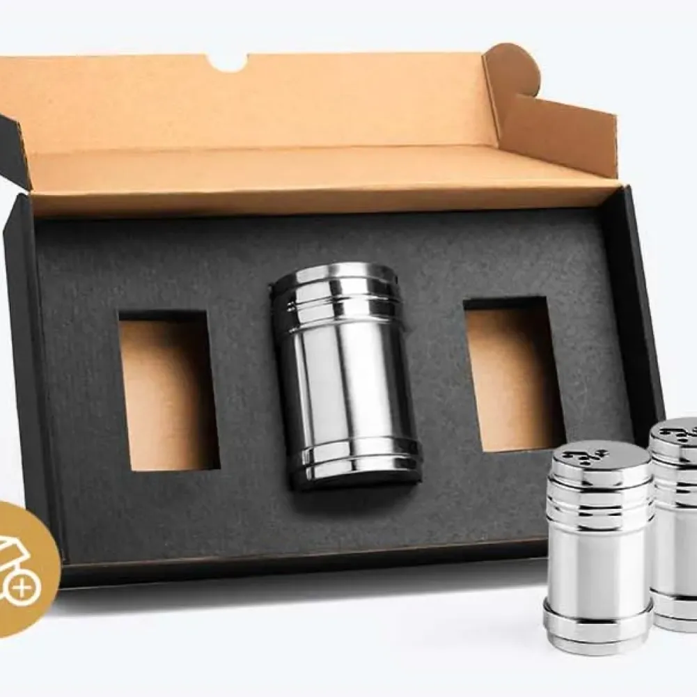 Kit contendo três potes de aço inox para temperos com tampa giratória. Tipo de gravação: Uma gravação a Laser na tampa da caixa. Dimensões do produto: Menor: 8x4cm / Maior: 11x6cm Dimensões da embalagem: 315x180x65 mm (AxLxP) Peso da embalagem: 550 g Embalagem do produto: Caixa Preta