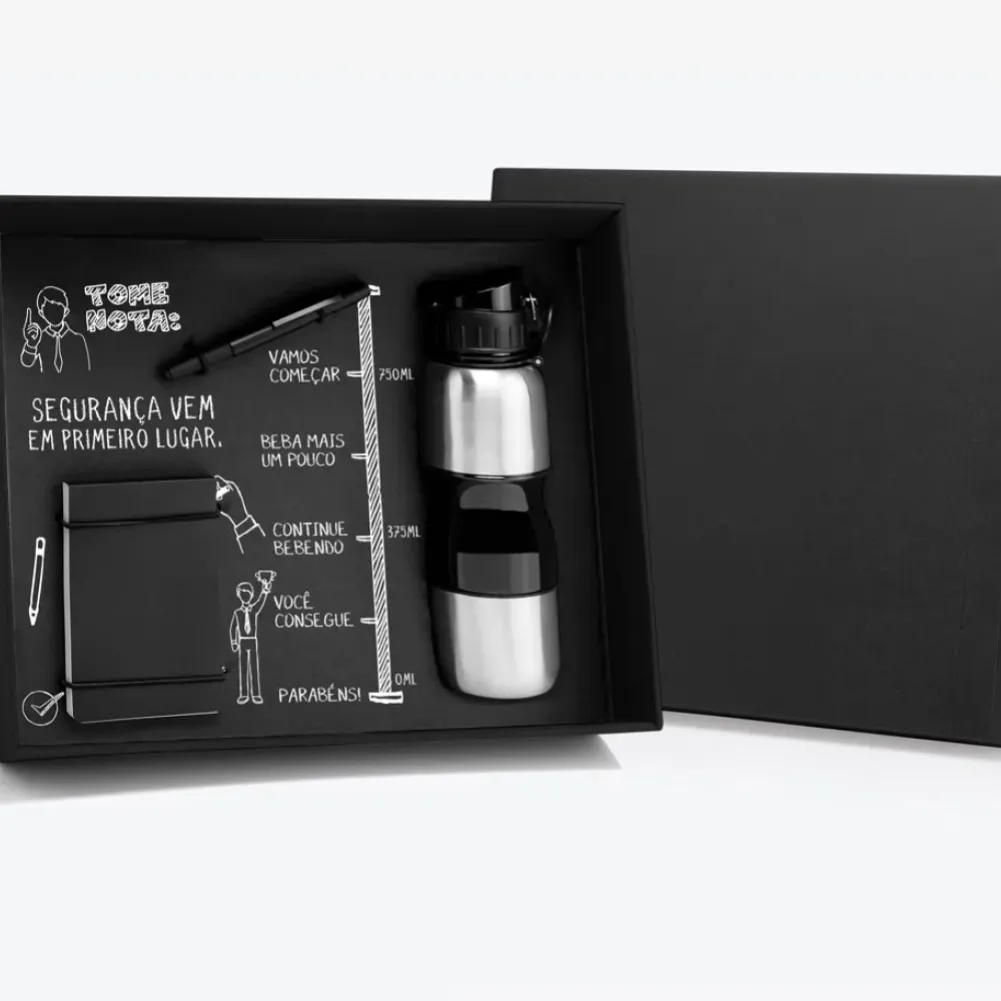 Squeeze confeccionado em plástico SAN e revestido em aço inox escovado. Possui tampa rosqueável abre e fecha com mola e botão com trava. Conta também com prático copo rosqueável na parte inferior de 200ml. Bloco com 100 folhas e caneta em ABS preta e ponteira touch em silicone preto. Carga esferográfica azul. Tipo de gravação: Uma gravação em Silkscreen na capa do bloco, caneta e na tampa da caixa; a Laser no squeeze. Dimensões do produto: Squeeze: 750ml Dimensões da embalagem: 370x300x105 mm (AxLxP) Peso da embalagem: 660 g Embalagem do produto: Caixa Preta