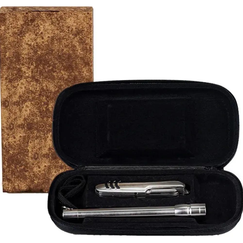 Composto por uma lanterna em alumínio com alça de mão que funciona através de duas pilhas AAA não inclusas e um canivete em metal com 5 funções, sendo lâmina 3”, abridor de latas, abridor de garrafas com chave de fenda, chave phillips e saca-rolhas. Acomodados em uma embalagem interna aveludada em um estojo com zíper. Tipo de gravação: Uma gravação em Silkscreen no estojo, a laser no Canivete e (clara) na Lanterna. Dimensões do produto: Lanterna: 14x1,8cm / Canivete: 9x2,5x1cm Dimensões da embalagem: 200x120x40 mm (AxLxP) Peso da embalagem: 250 g Embalagem do produto: Caixa Kraft