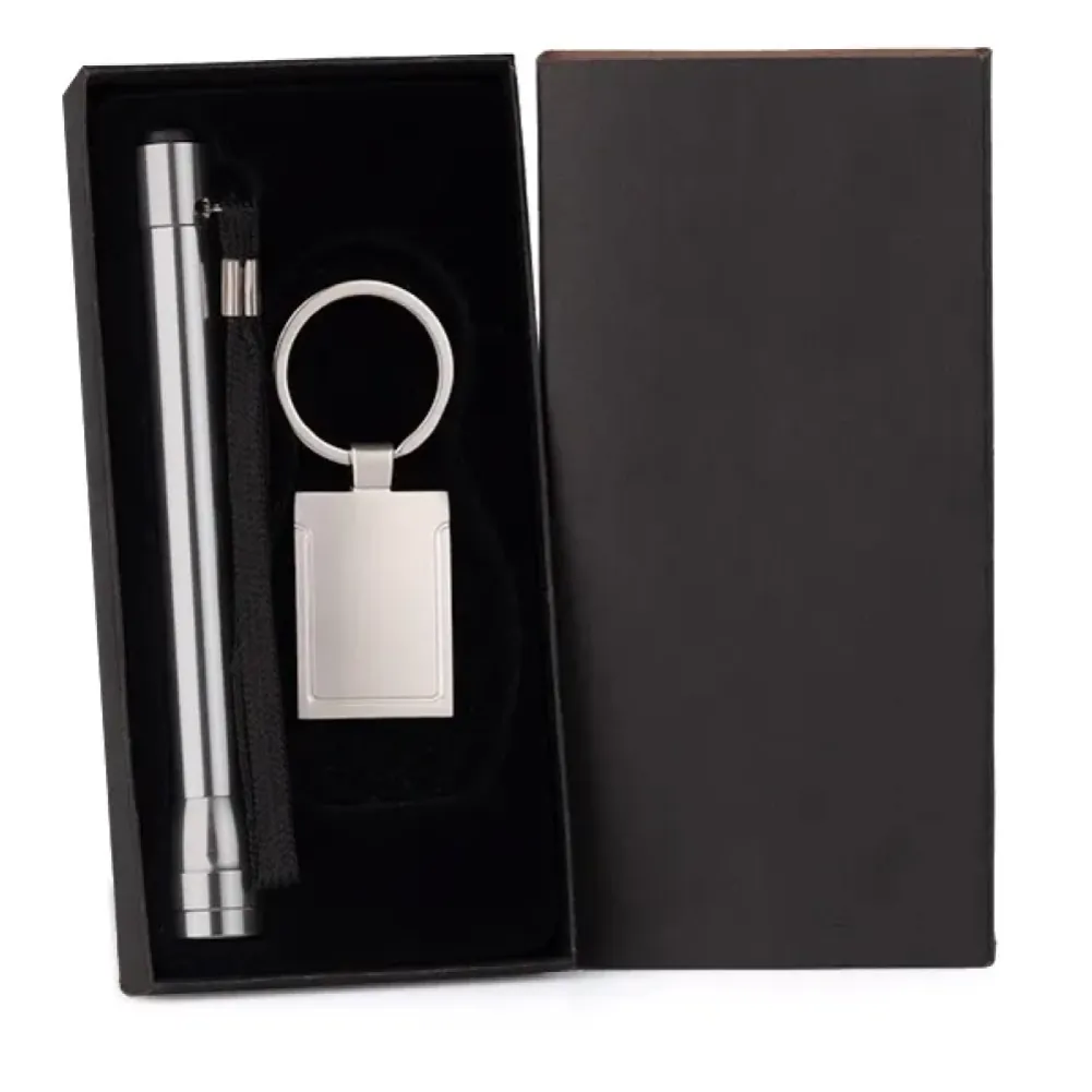 Conjunto com lanterna em Alumínio e chaveiro em Metal. Lanterna em lâmpada, acionada através de duas pilhas AAA (não inclusas). Chaveiro com acabamento Cromado Fosco Envelhecido. Tipo de gravação: Uma gravação a Laser na lanterna e em um lado do chaveiro. Dimensões do produto: Lanterna: 14x1,8cm / Chaveiro: 7,5x2,8x0,4cm Dimensões da embalagem: 165x80x20 mm (AxLxP) Peso da embalagem: 86 g Embalagem do produto: Caixa Preta