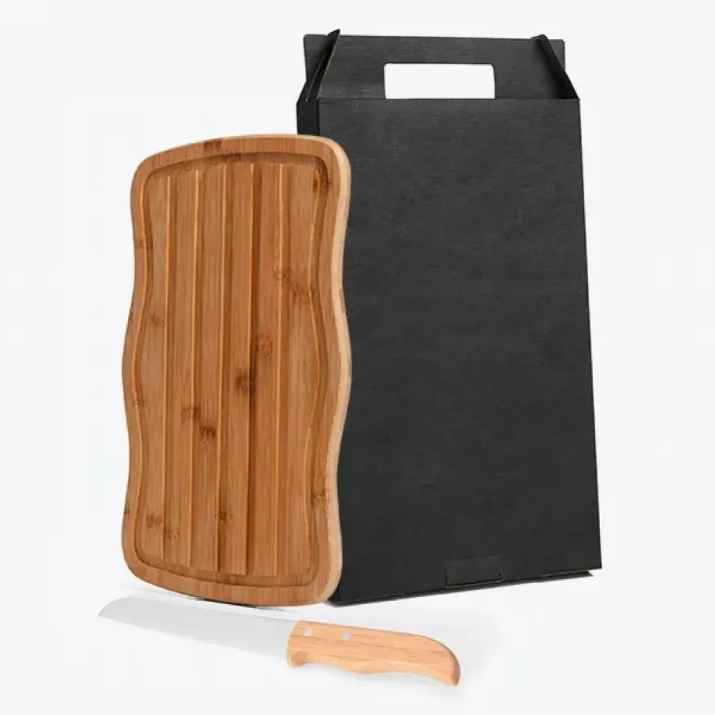 Kit para petisco e cozinha com tábua em bambu. Acompanha faca para pão em Metal/Bambu. Tábua confeccionada com tripla camada invertida, para dar maior durabilidade. Produto 2 em 1, de um lado da tábua é especifica para cortar pães, do outro é ideal para queijos e petiscos. Tipo de gravação: Uma gravação a Laser na tábua e na lâmina da faca. Dimensões do produto: Tábua: 37x22,5x1,5cm Dimensões da embalagem: 390x240x50 mm (AxLxP) Peso da embalagem: 910 g Embalagem do produto: Caixa Preta