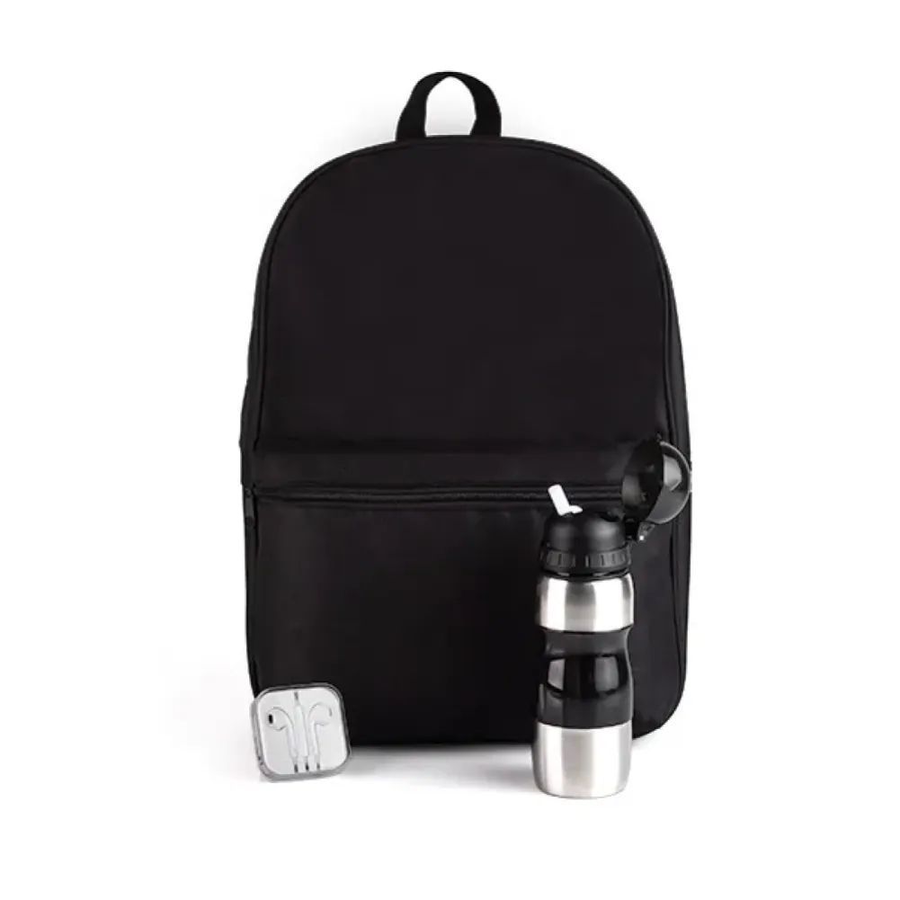 Mochila preta confeccionada em Polyester 600D, squeeze confeccionado em plástico SAN (Estinero Acrilonitrilo) revestido em aço inox escovado; Fone de ouvido branco com microfone, controle de volume e estojo plástico. Tipo de gravação: Uma gravação em Silkscreen na mochila e no estojo do fone; Laser na squeeze. Dimensões do produto: Squeeze: 19x6Øcm Dimensões da embalagem: 430x300x120 mm (AxLxP) Peso da embalagem: 566 g Embalagem do produto: Plástica (Embalados na mochila)