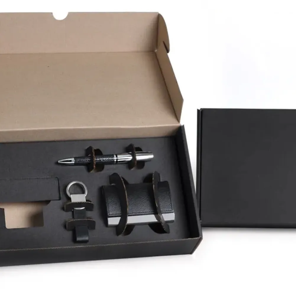 Kit office. Conta com uma caderneta de 80 folhas preto; porta-cartão em material sintético preto texturizado e metal cromado para aproximadamente 20 cartões; caneta esferográfica em metal com corpo revestido em material sintético preto texturizado; chaveiro em metal com material sintético preto. Tipo de gravação: Uma gravação a Laser na caneta, porta cartão e chaveiro; Silk Screen na capa do caderno. Dimensões do produto: Caderno: 9,5x15,5 cm Dimensões da embalagem: 315x180x65 mm (AxLxP) Peso da embalagem: 355 g Embalagem do produto: Caixa Preta
