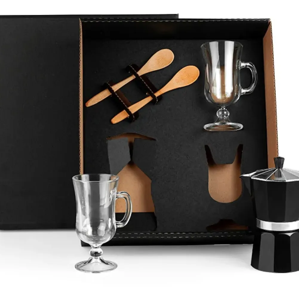 Kit para café. Conta com cafeteira em alumínio, duas colheres em bambu e duas canecas em vidro 240ml cada. Tipo de gravação: Uma gravação a Laser na cafeteira e nas canecas. Dimensões do produto: Cafeteira: 16,5x17x16,5 Dimensões da embalagem: 395x347x120 mm (AxLxP) Peso da embalagem: 1.424 g Embalagem do produto: Caixa Preta