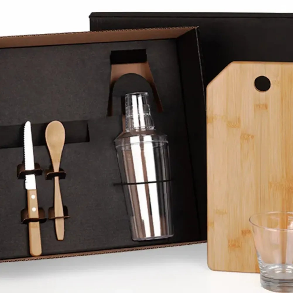 Kit para caipirinha e drink com coqueteleira em plástico PS; Tábua e colher 18cm em bambu; Faca 4" para frutas em bambu/i nox; Copo em vidro. Coqueteleira livre de BPA - bisfenol. A (substância química prejudicial a saúde e encontrada em plásticos). Estão perfeitamente acomodados em uma caixa para presentear. Tipo de gravação: Uma gravação a Laser na tábua, no copo de vidro e na tampa da caixa; em Silk na coqueteleira Dimensões do produto: Capacidade coqueteleira: 600ml / Capacidade dosador: 50ml Dimensões da embalagem: 380x330x110 mm (AxLxP) Peso da embalagem: 1.279 g Embalagem do produto: Caixa Preta