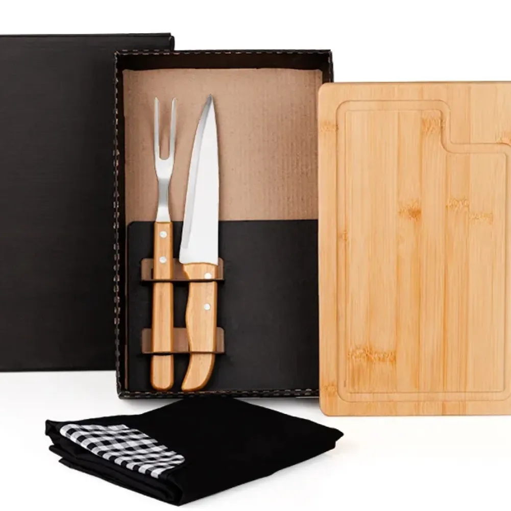 KIT PARA CHURRASCO BAMBU / INOX COM AVENTAL E TÁBUA 4 PÇS