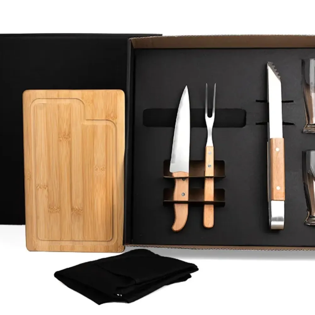Kit para churrasco com pegador. Conta com tábua em Bambu; Faca 7"", garfo e pegador em aço Inox/Madeira; dois copos de vidro para cerveja; Avental em Brim preto. Tipo de gravação: Uma gravação a Laser na tábua, na faca, no pegador e nos copos. Dimensões do produto: Tábua: 32x20x1,2cm Dimensões da embalagem: 465x410x120 mm (AxLxP) Peso da embalagem: 1.778 g Embalagem do produto: Caixa Preta