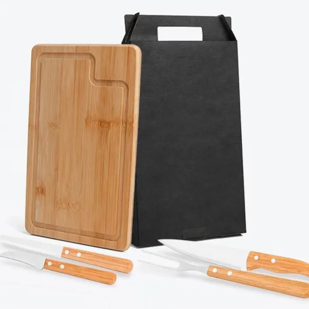 KIT PARA CHURRASCO EM BAMBU COM TÁBUA RETANGULAR E FACAS