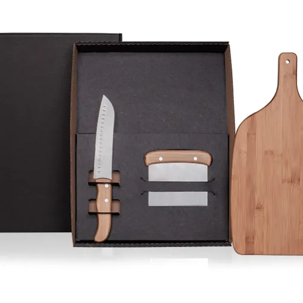 Conta com tábua em bambu; Faca santoku e espátula multiuso em bambu/Inox. Tipo de gravação: Uma gravação a Laser na tábua, na espátula e na faca. Dimensões do produto: Tábua: 39,5x21,5x1,5cm Dimensões da embalagem: 425x325x65 mm (AxLxP) Peso da embalagem: 1.180 g Embalagem do produto: Caixa Preta