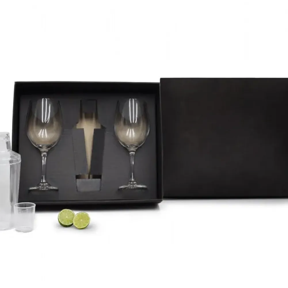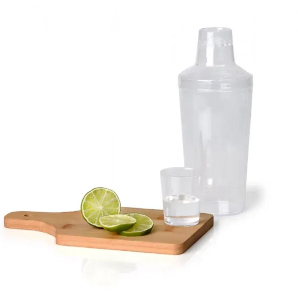 Kit composto por coqueteleira em plástico PS (poliestireno) com tampa, coador, dosador em ml e oz. Conta também com duas taças em vidro com capacidade de 490 ml cada uma. Tipo de gravação: Uma gravação em Silk Screen na coqueteleira e na tampa da caixa; Laser nas duas taças. Dimensões do produto: Capacidade coqueteleira: 600ml Dimensões da embalagem: 366x298x100 mm (AxLxP) Peso da embalagem: 965 g Embalagem do produto: Caixa Preta