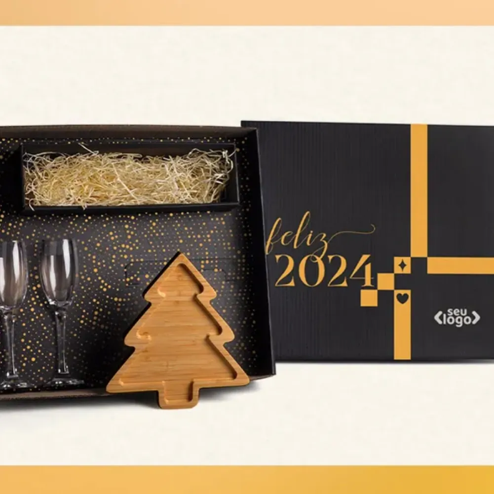 Kit para petisco. Kit composto por petisqueira com formato de pinheiro, duas taças de vidro para champanhe e espaço para garrafa (NÃO ACOMPANHA GARRAFA). Tipo de gravação: Uma gravação a Laser na petisqueira e nas duas taças; Silk na tampa. Dimensões do produto: Petisqueira: 24x22cm Dimensões da embalagem: 465x410x120 mm (AxLxP) Peso da embalagem: 1.215 g Embalagem do produto: Caixa Preta