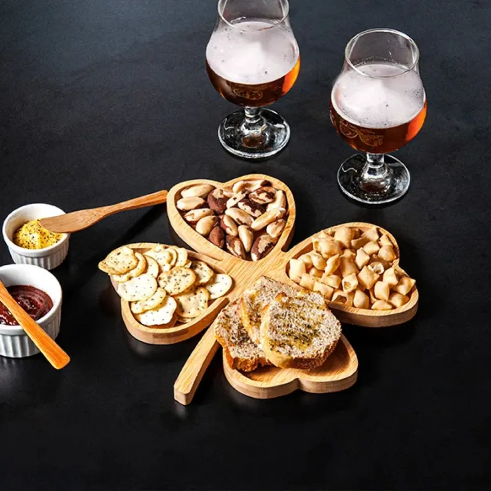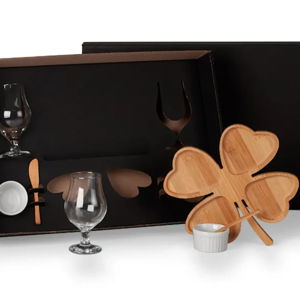 Conta com petisqueira em bambu com formato de trevo de 4 folhas e duas espátulas em bambu de 14 cm; Duas taças de vidro para cerveja/drink e dois ramekins em porcelana. Tipo de gravação: Uma gravação a Laser nas duas taças, na tábua e na tampa da caixa. Dimensões do produto: Petisqueira: 26x26x1,7cm Dimensões da embalagem: 580x395x120 mm (AxLxP) Peso da embalagem: 1.491 g Embalagem do produto: Caixa Preta
