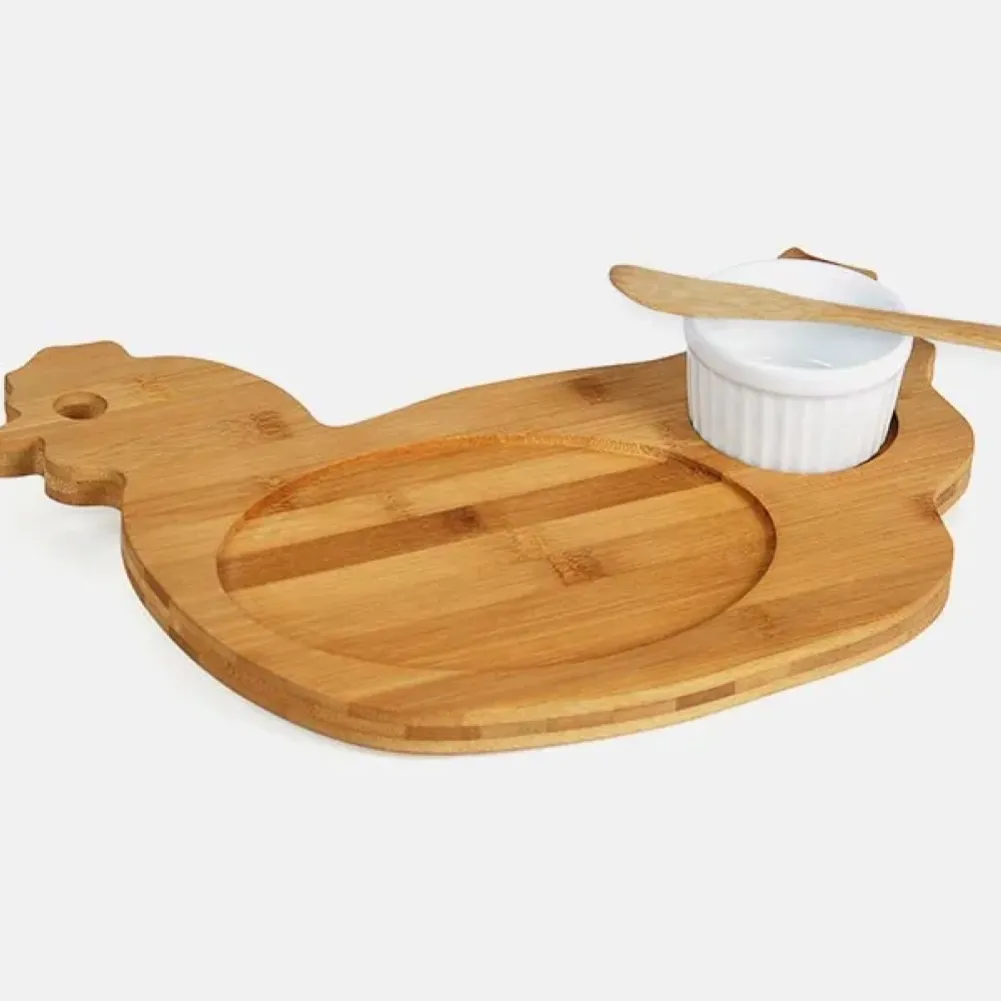 KIT PETISCO EM BAMBU / PORCELANA COM TÁBUA FORMATO GALINHA