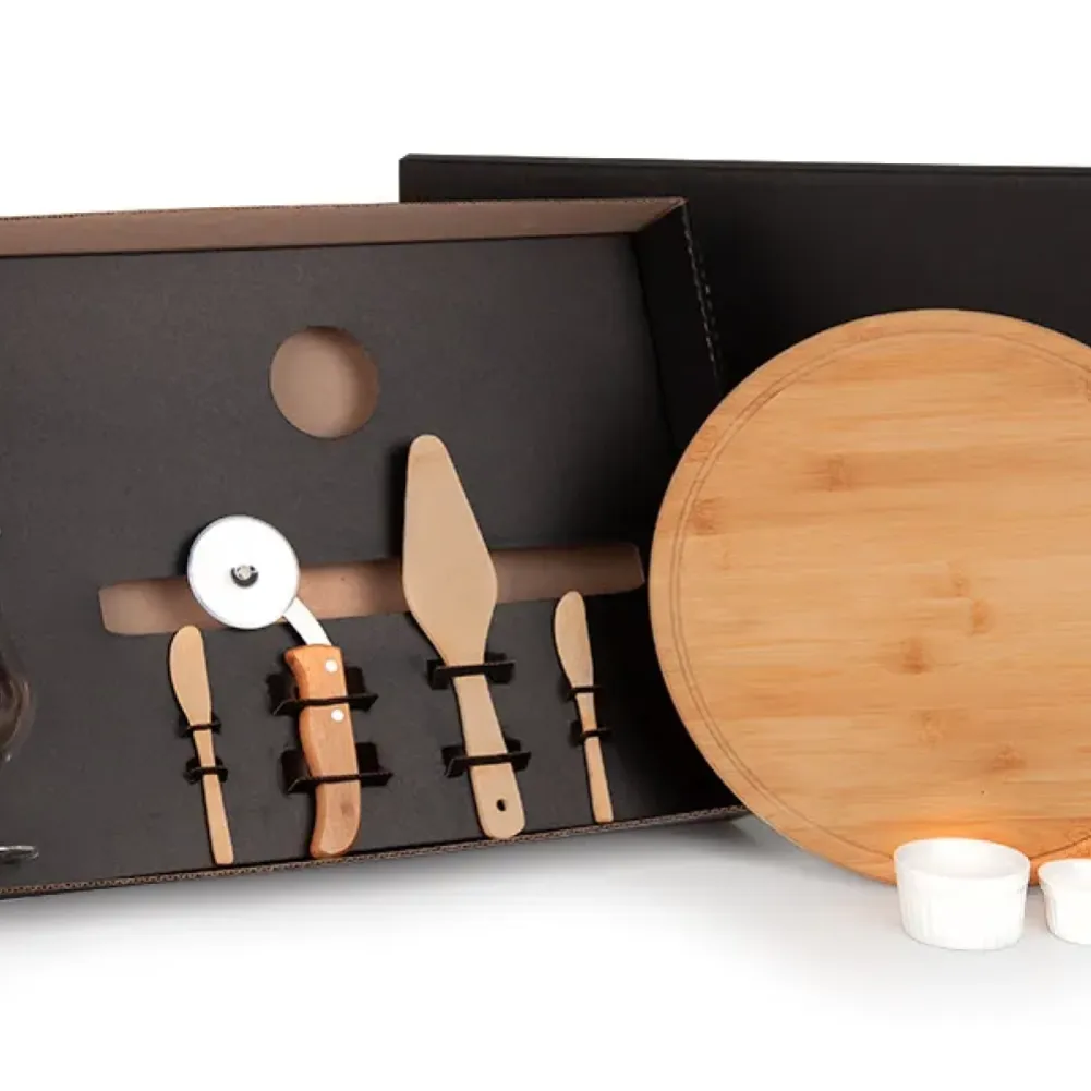 Kit para pizza e cerveja. Conta com tábua para petisco/pizza, espátula para pizza e duas espátulas 14cm em bambu; Cortador de pizza em bambu/inox; Duas taças para cerveja em vidro e dois ramekins em porcelana. Tipo de gravação: Uma gravação a Laser nas duas taças, na tábua e na tampa da caixa. Dimensões do produto: Tábua: 35x1,2cm Dimensões da embalagem: 575x395x120 mm (AxLxP) Peso da embalagem: 2.585 g Embalagem do produto: Caixa Preta