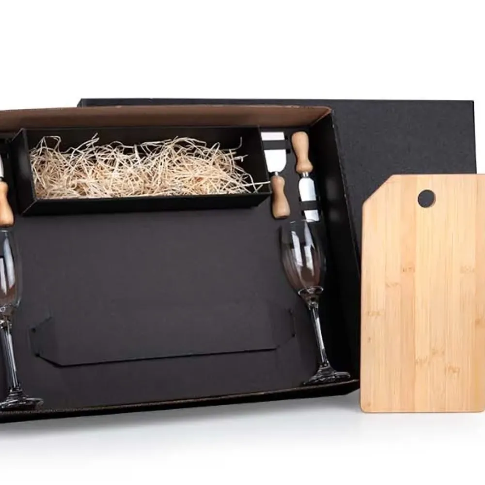 Conta com tábua em bambu; Duas facas, uma espátula e um garfo para queijo; Duas taças para champanhe em vidro; Espaço para garrafa com palha (NÃO ACOMPANHA GARRAFA). Estão perfeitamente acomodados em uma caixa para presentear. Tipo de gravação: Uma gravação a Laser nas duas taças, na tábua e na tampa da caixa. Dimensões do produto: Tábua: 32x17x1,2cm Dimensões da embalagem: 580x395x120 mm (AxLxP) Peso da embalagem: 1.531 g Embalagem do produto: Caixa Preta