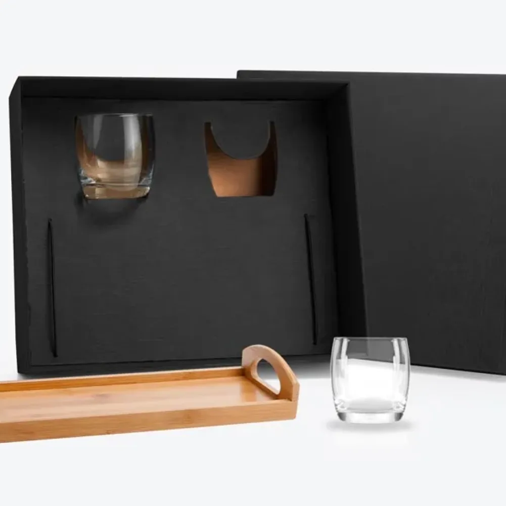 Kit whisky. Conta com dois copos em vidro e bandeja em bambu. Estão perfeitamente acomodados em uma caixa para presentear. Tipo de gravação: Uma gravação a Laser na bandeja, nos dois copos e na tampa da caixa. Dimensões do produto: Bandeja: 32x14,5x5,5cmCopo: 330 ml cada Dimensões da embalagem: 370x300x105 mm (AxLxP) Peso da embalagem: 1.035 g Embalagem do produto: Caixa Preta