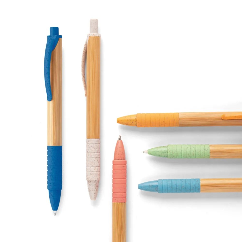 Esferográfica em bambu com clipe antideslizante e elementos coloridos em fibra de trigo e ABS. Escrita a azul. ø11 x 142 mm