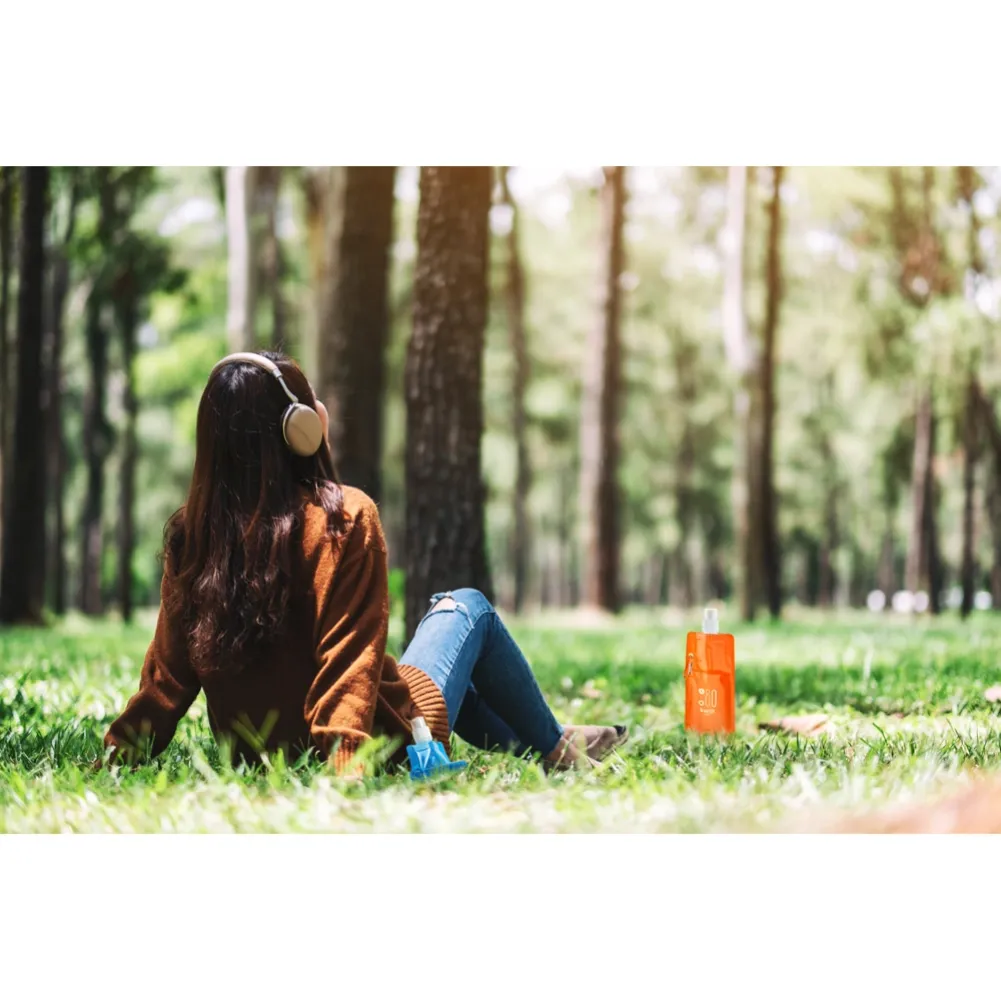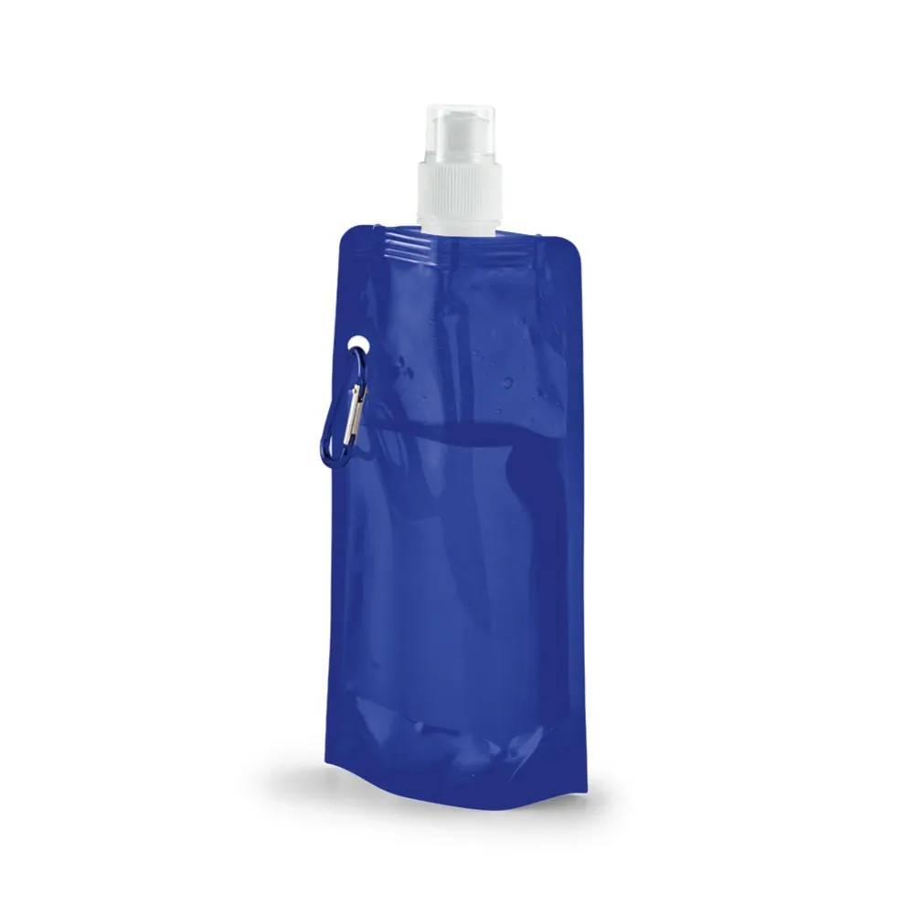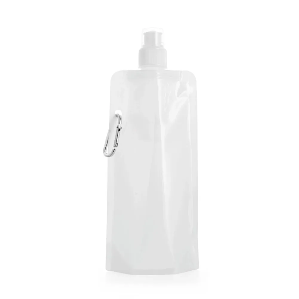 Squeze dobrável em PE com bico de sistema "push-pull" e acabamento translúcido. Contém uma tampa transparente e um mosquetão. Capacidade até 460 mL. Certificação EU Food Grade. 120 x 265 x 30 mm