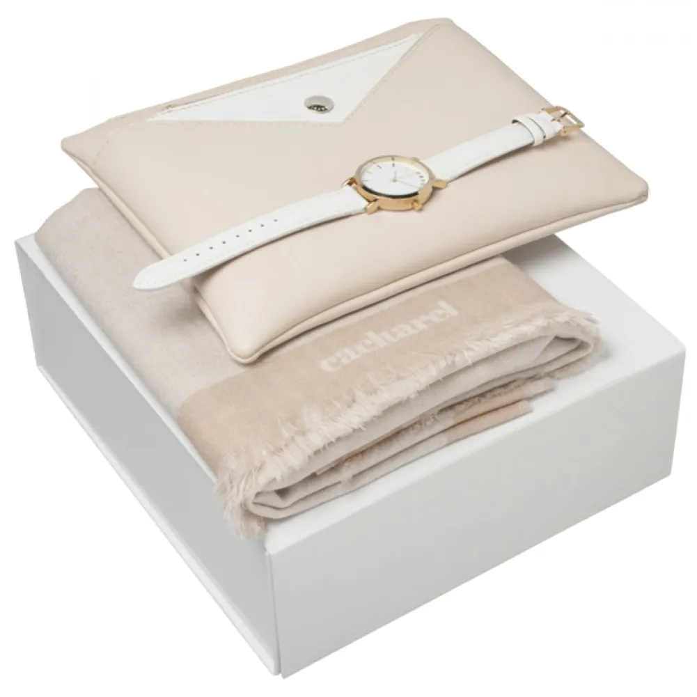 Cachecol 100% lã. Bolsa em c. sintético. Relógio com pulseira em couro, resistência à água de 3 ATM e pilha SR626SW inclusa. Fornecido em caixa de oferta. Cachecol: 500 x 1800 mm. Bolsa: 220 x 175 x 10 mm. Relógio: ø36 x 240 mm. Caixa: 210 x 235 x 80 mm |