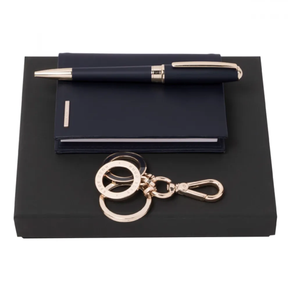 Kit capa A7, chaveiro e esferográfica. Dark Blue. Coleção Essencial. Embalagem "Hugo Boss" inclusa (HBP500). Capa para usar com os cadernos standard A7. Capa: 87 x 115 x 14 mm | Chaveiro: ø30 x 40 mm | Esferográfica: ø13 x 142 mm | Caixa: 150 x 174 x 30 mm