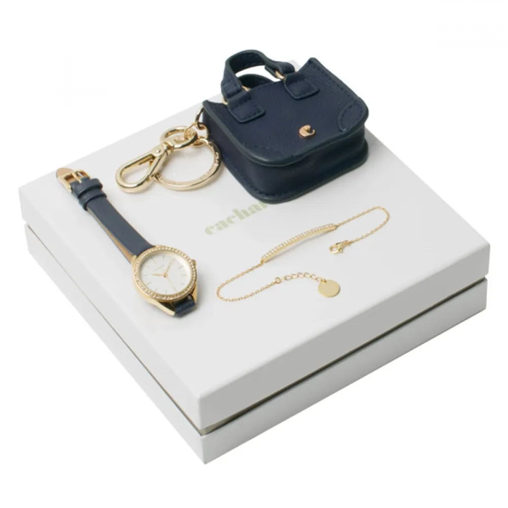 Pulseira em prata. Chaveiro em c. sintético. Relógio com pulseira em couro, pilha SR626SW inclusa e resistência à água de 3 ATM. Fornecido em caixa de oferta. Pulseira: 190 mm. Chaveiro: 80 x 65 x 25 mm. Relógio: ø28 x 220 mm. Caixa: 160 x 160 x 47 mm |
