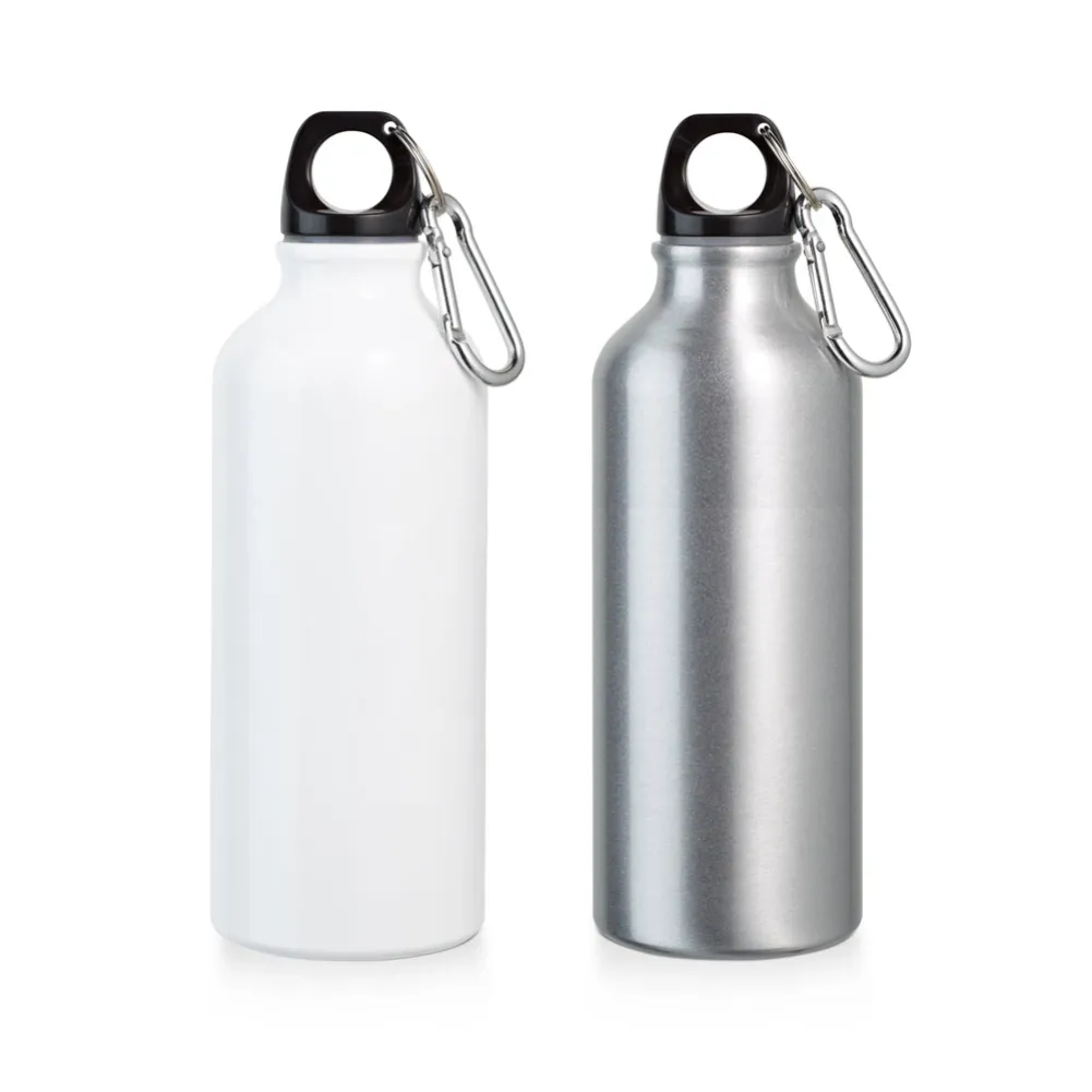 Squeeze em alumínio para sublimação com mosquetão e capacidade até 500 mL. Certificação EU Food Grade. Caixa branca 94656 vendida opcionalmente. ø66 x 210 mm