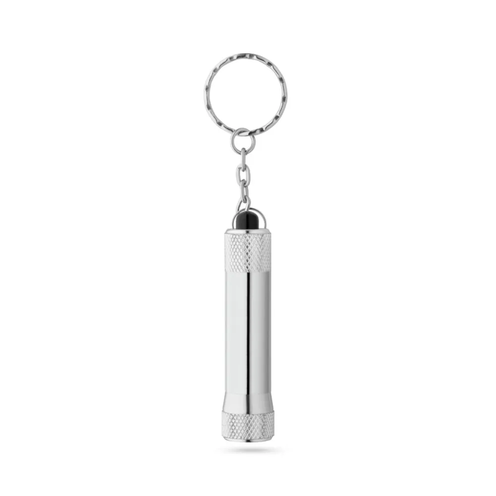 Chaveiro em alumínio com lanterna de 3 luzes LEDs. Incluso 4 pilhas LR44. ø17 x 62 mm