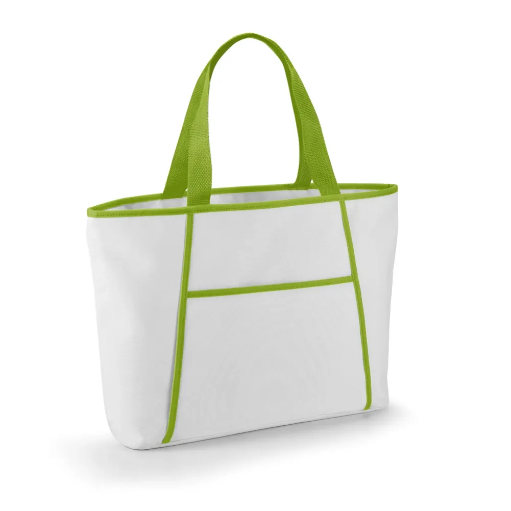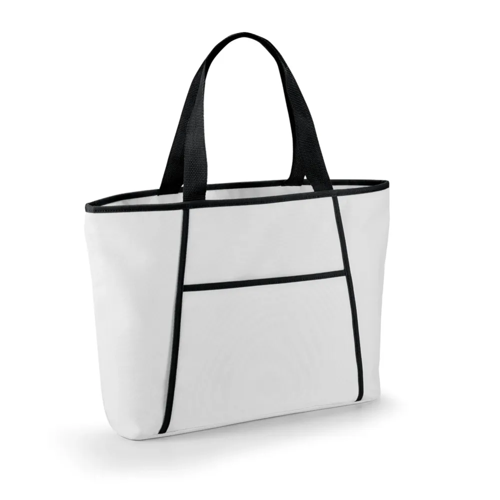 Sacola térmica em 600D com zíper e compartimento exterior aberto forrado que contém um bolso frontal. Ideal para levar para a praia. Alças em webbing com 55 cm e capacidade até 9 L. Certificação EU Food Grade. 470 x 305 x 120 mm