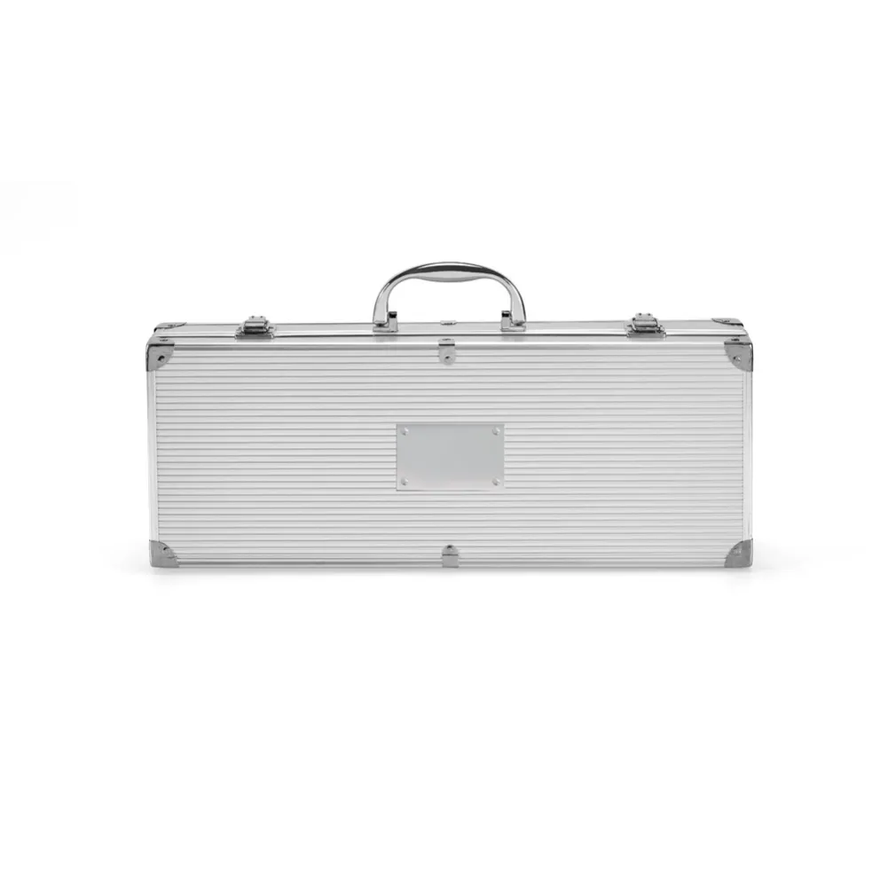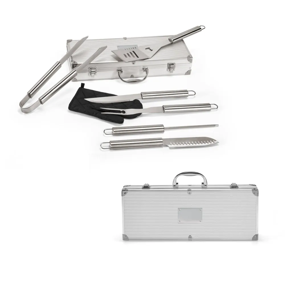 Kit churrasco em estojo de alumínio. Composto por luva de cozinha em poliéster e 6 utensílios em aço inox: faca chefe, 1 faca japonesa, 1 pinça, 1 garfo, 1 espátula e 1 afiador. Próprio para contato com alimento. Estojo: 450 x 170 x 80 mm | Placa: 80 x 50 mm