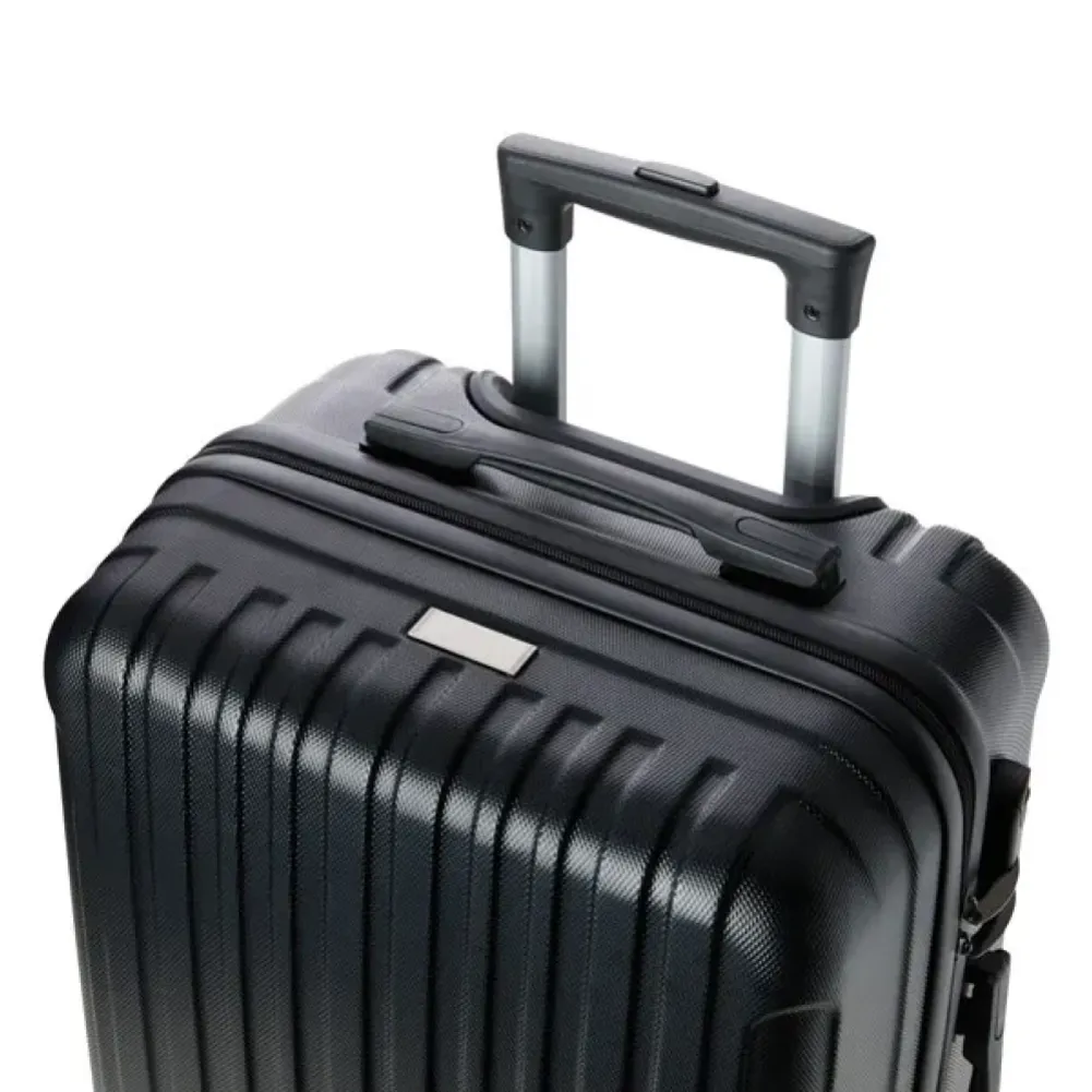 Mala de viagem em ABS rígido preto. Conta com rodinhas 360º, fechamento em zíper e cadeado com senha, alça retrátil de alumínio e duas alças de mão. Parte interna com forro e divisória com zíper. Tipo de gravação: Uma gravação a Laser na plaquinha de metal e Silk no saco de TNT. Dimensões do produto: 59,5x39,5x28cm Dimensões da embalagem: 595x395x280 mm (AxLxP) Peso da embalagem: 2.900 g Embalagem do produto: Saco TNT preto
