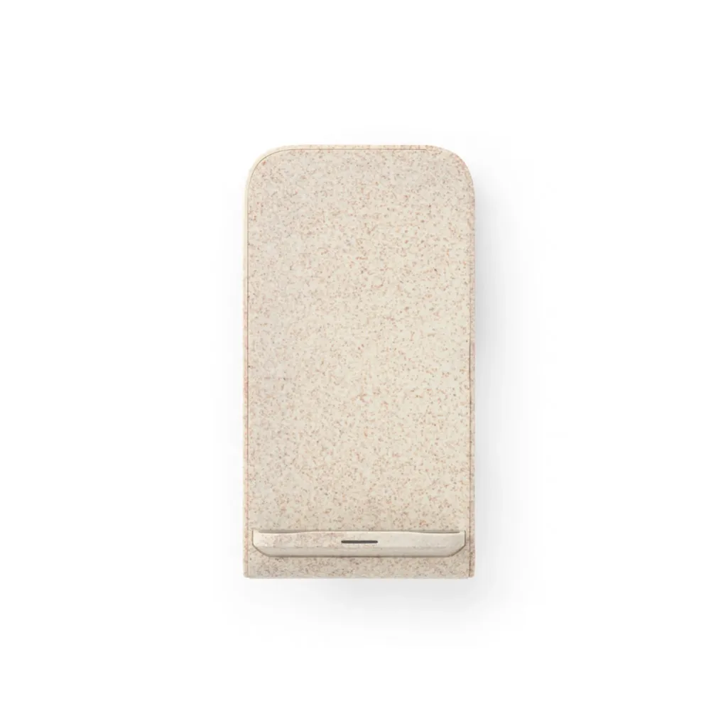 Suporte para celular com carregador wireless em fibra de palha de trigo e ABS. Com uma potência de carregamento rápida de 10W e com entradas 5V/2A e 9V/167A. Incluso cabo de carregamento micro USB de 1 m. Fornecido em caixa presente de papel kraft. 70 x 112 x 87 mm
