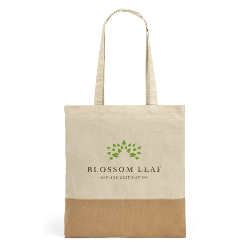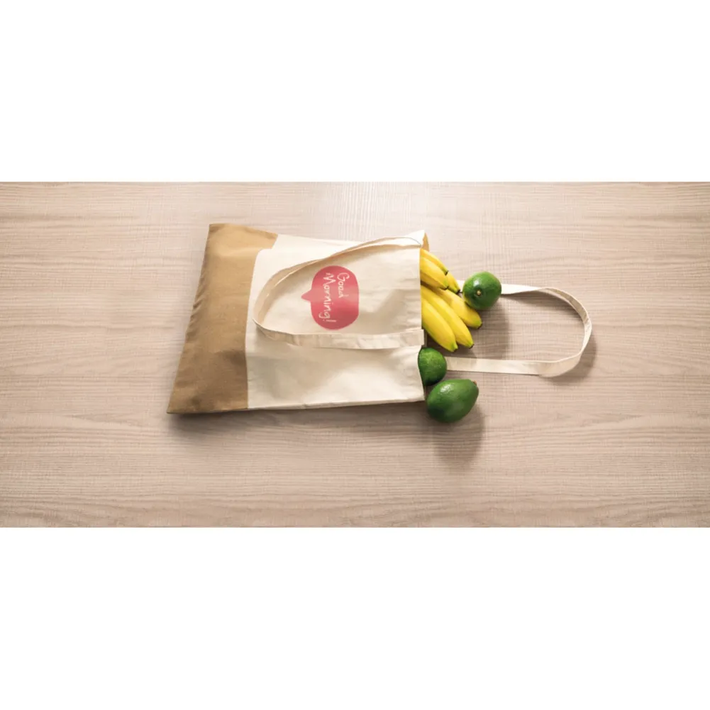 Sacola 100% algodão (160 g/m²) com detalhe em imitação de juta e alças de 65 cm. 375 x 415 mm