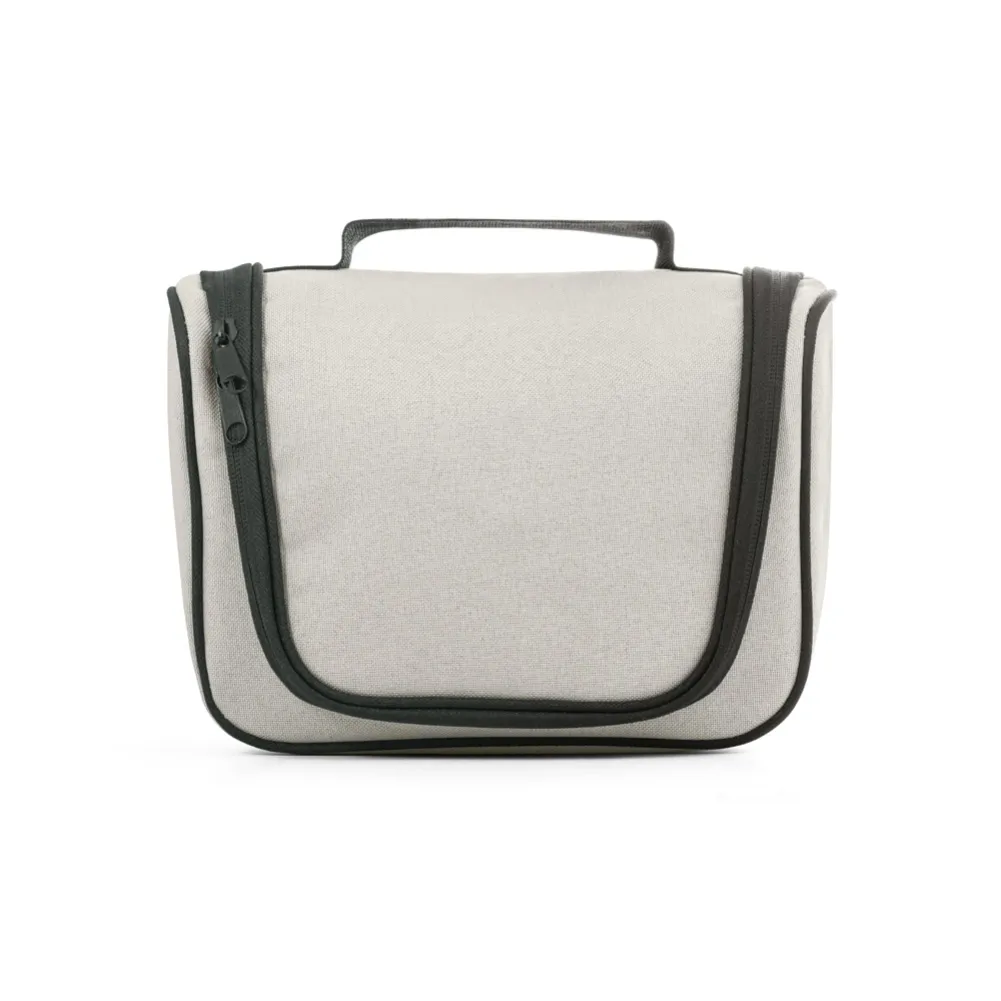 Bolsa de cosméticos em 600D de alta densidade. O compartimento principal tem zíper duplo e revestimento interior em 210D. Contém vários bolsos interiores e gancho no topo para pendurar. 250 x 180 x 105 mm