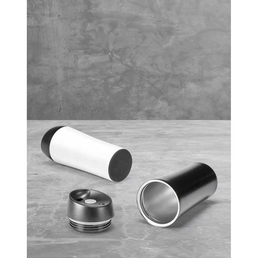 Copo de viagem em aço inox com corpo duplo, tampa em PP com sistema anti derrame e antideslizante na base (térmico). Capacidade até 470 mL. Preserva as bebidas quentes por 8h e frias por 24h. Certificação EU Food Grade. Fornecido em caixa presente preta. ø80 x 198 mm | Caixa: 82 x 202 x 82 mm