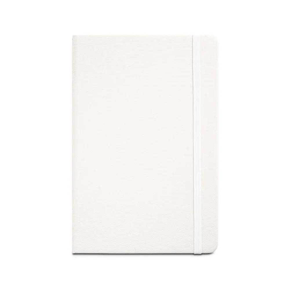 Caderno A5 em rPET com tratamento antibacteriano, segundo a certificação ISO 20743. Contém 80 folhas pautadas cor marfim, em papel proveniente de gestão florestal sustentável, elástico e fita separadora. 140 x 210 mm