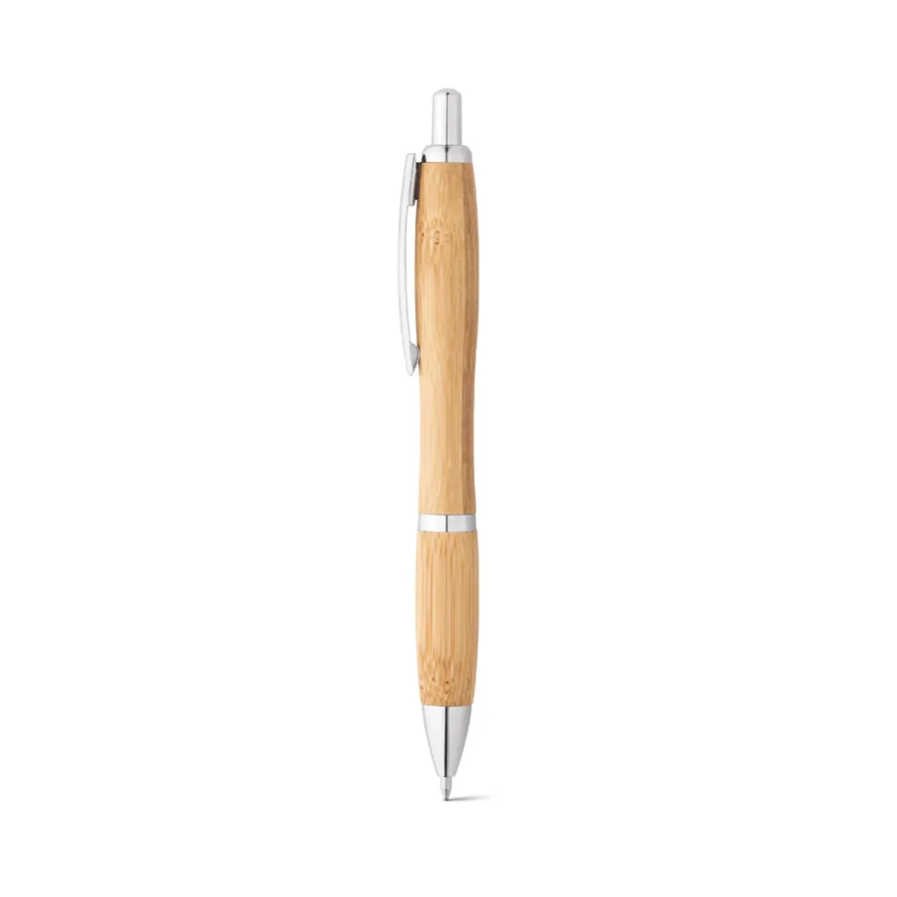 Esferográfica em bambu com clipe e detalhes em metal. Escrita a preto. ø13 x 143 mm