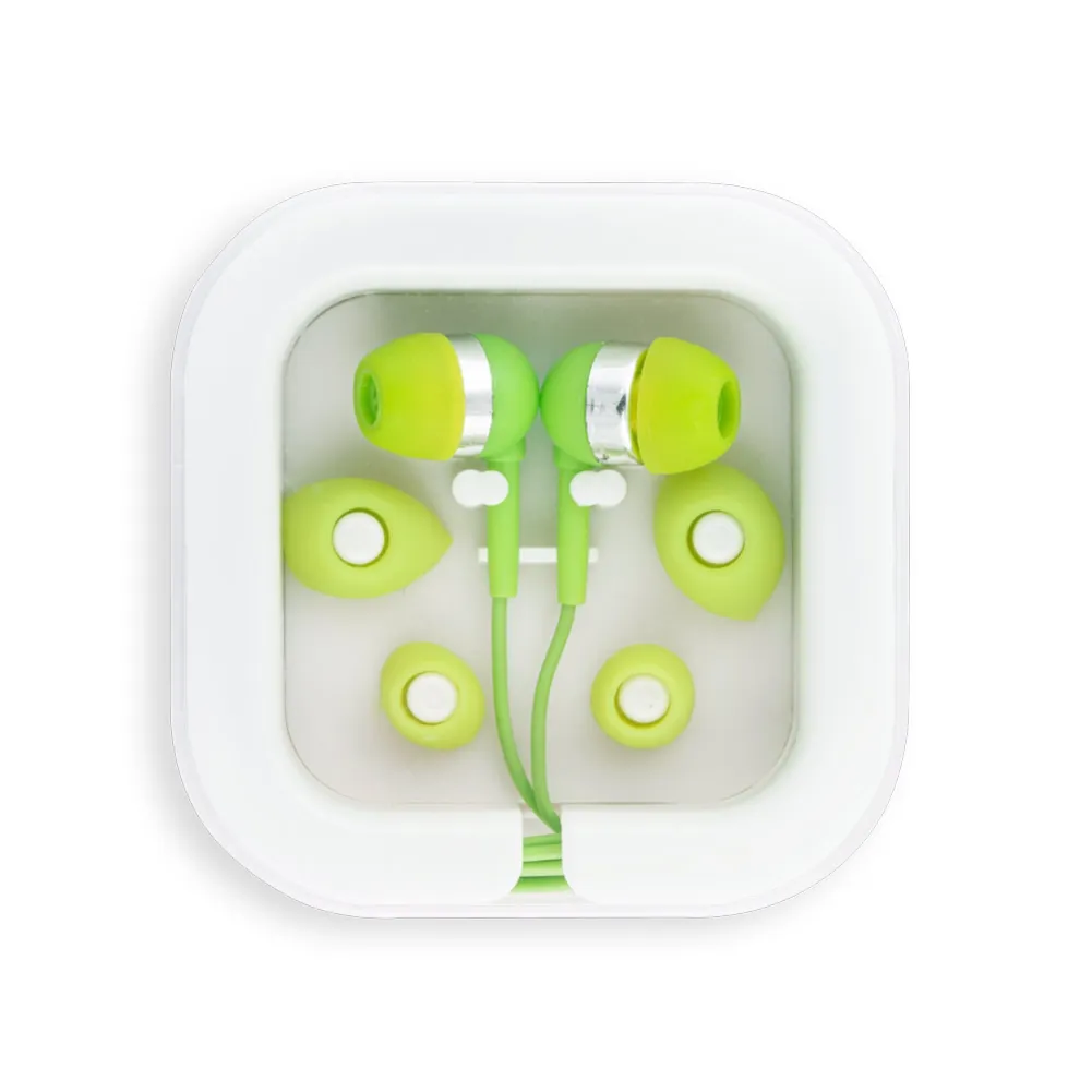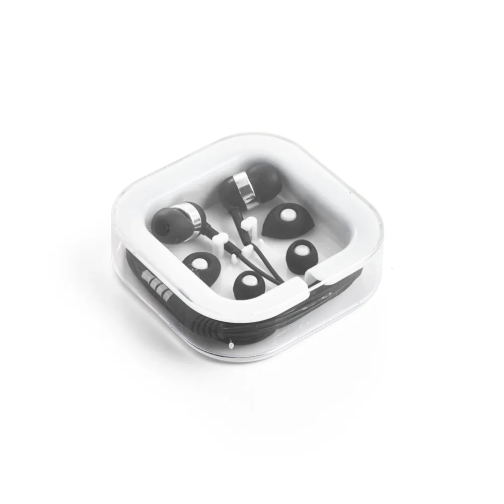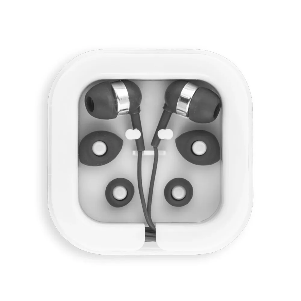 Fone de ouvido com microfone incorporado e cabo de 1.20 m com ligação stereo 3.5 mm. Incluso 2 pares extra de adaptadores de fone em silicone (dois tamanhos diferentes). Fornecidos em caixa de PS e ABS. 70 x 70 x 18 mm
