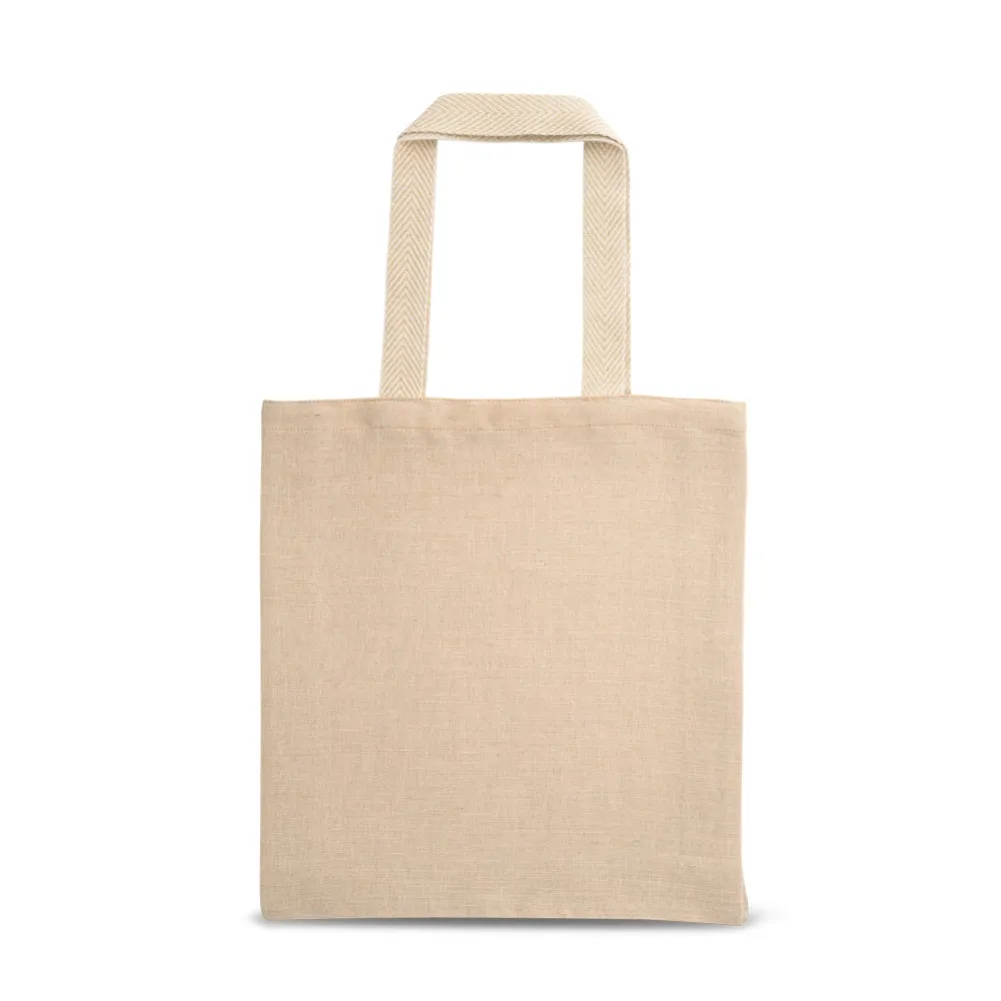 Sacola em juco (275 g/m²) com bolso interior 100% algodão (120 g/m²) com fecho e alças de 60 cm. Pegas em webbing de algodão bicolor. 370 x 410 x 90 mm