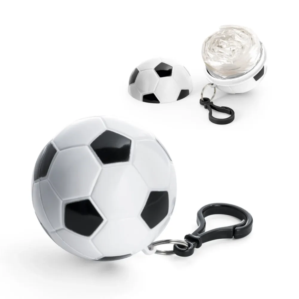 Capa de chuva de tamanho único fornecida dentro de embalagem em formato de bola de futebol com chaveiro e mosquetão. ø63 mm | 1200 x 900 mm