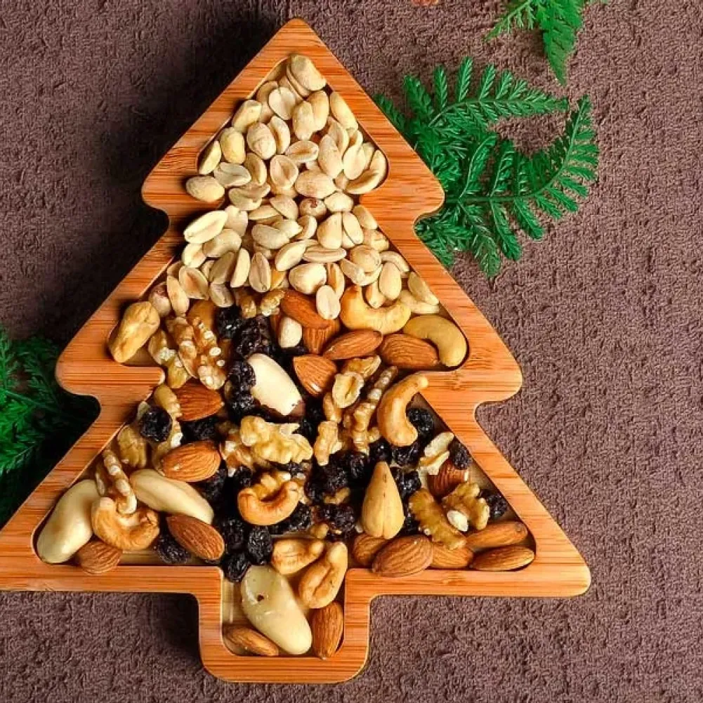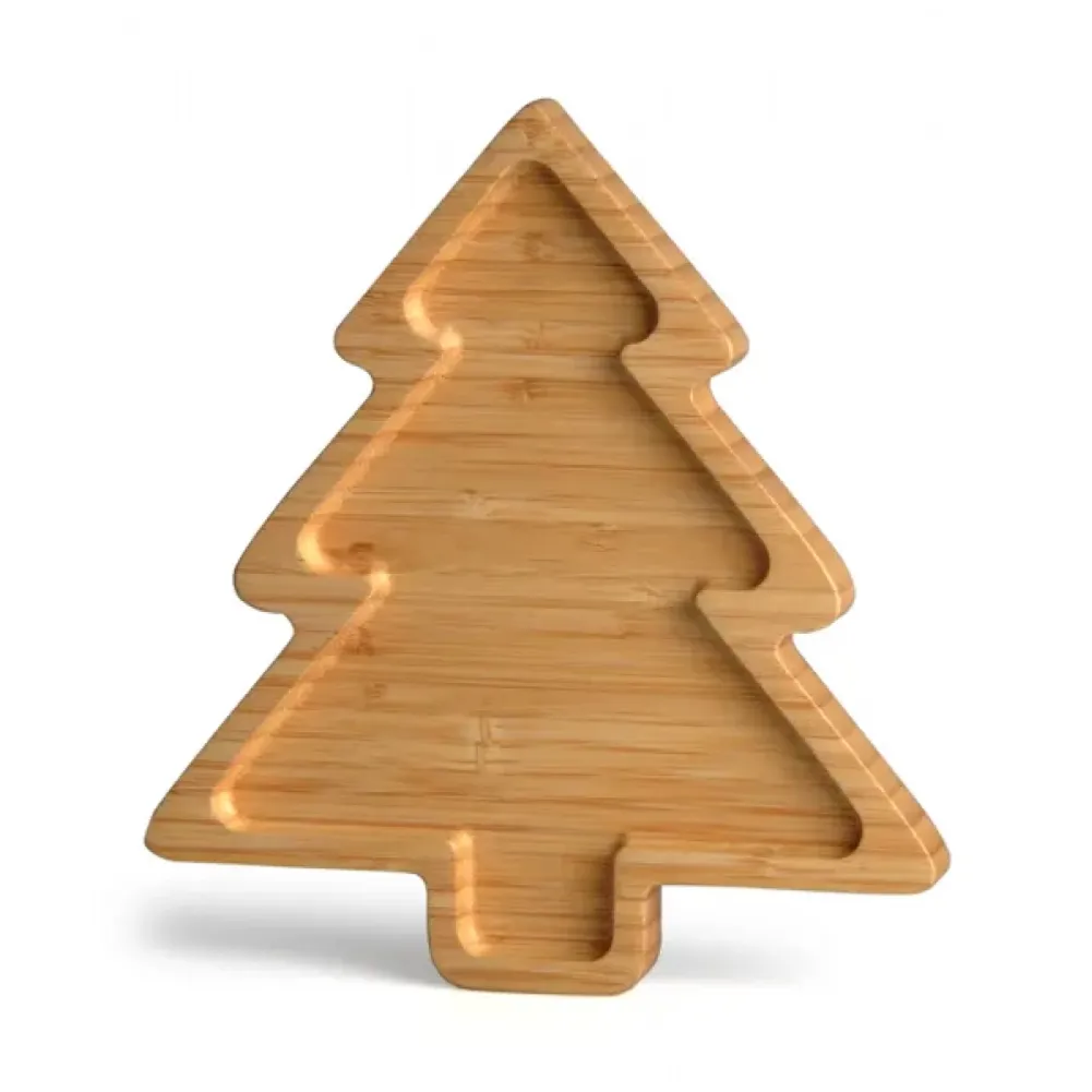 Petisqueira em bambu com formato de pinheiro. Tipo de gravação: Uma gravação a Laser. Dimensões do produto: 24x22x2cm Dimensões da embalagem: 240x220x20 mm (AxLxP) Peso da embalagem: 290 g Embalagem do produto: Plástica