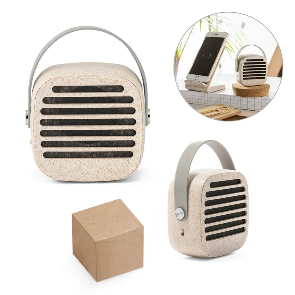 Caixa de som portátil em fibra de palha de trigo e ABS com alça em silicone para facilitar o transporte, potência de 3W e transmissão sem fios BT v50. Autonomia aproximada de 4h30, com uma bateria de 500 mAh. Incluso cabo micro USB. Fornecido em caixa presente de papel kraft. 70 x 70 x 34 mm